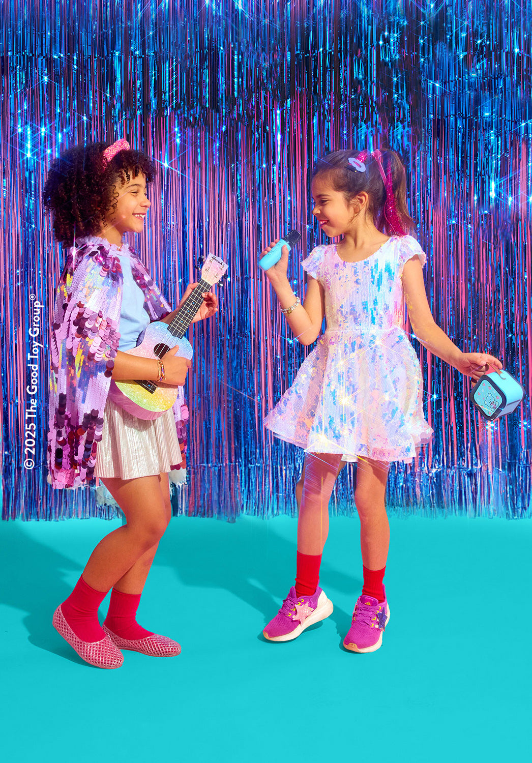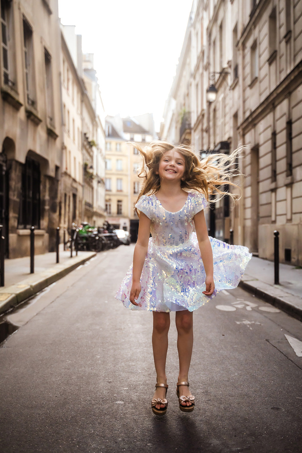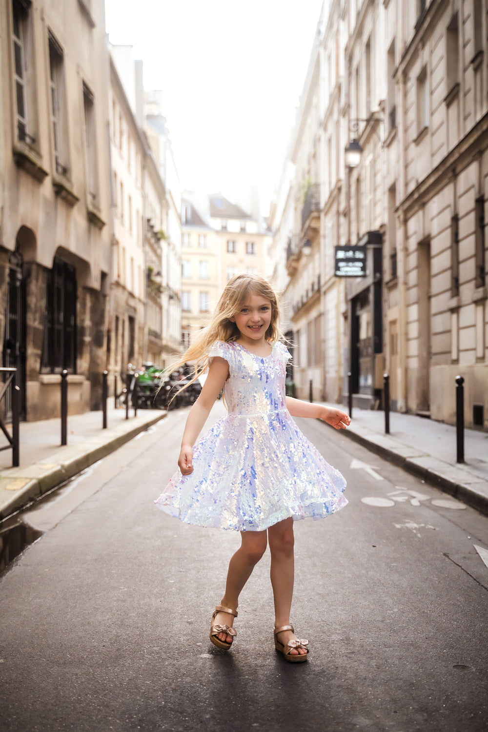 Encourage your young superstar's dreams of singing to sold out stadiums with the gift of this super sparkly dress. Covered in a mix of large and small iridescent sequins, the dress glows white at first glance, but reflects soft purples and rainbow hues as it moves - perfect for rising stars who love to shine. Short flutter sleeves add a playful touch while keeping it comfy for dancing, singing, and striking a pose just like Taylor Swift! This dazzling dress is sure to be your concert queen's new favorite outfit for pretend play, holiday parties, and even everyday trips to the toy store. Added perk: it's machine washable!