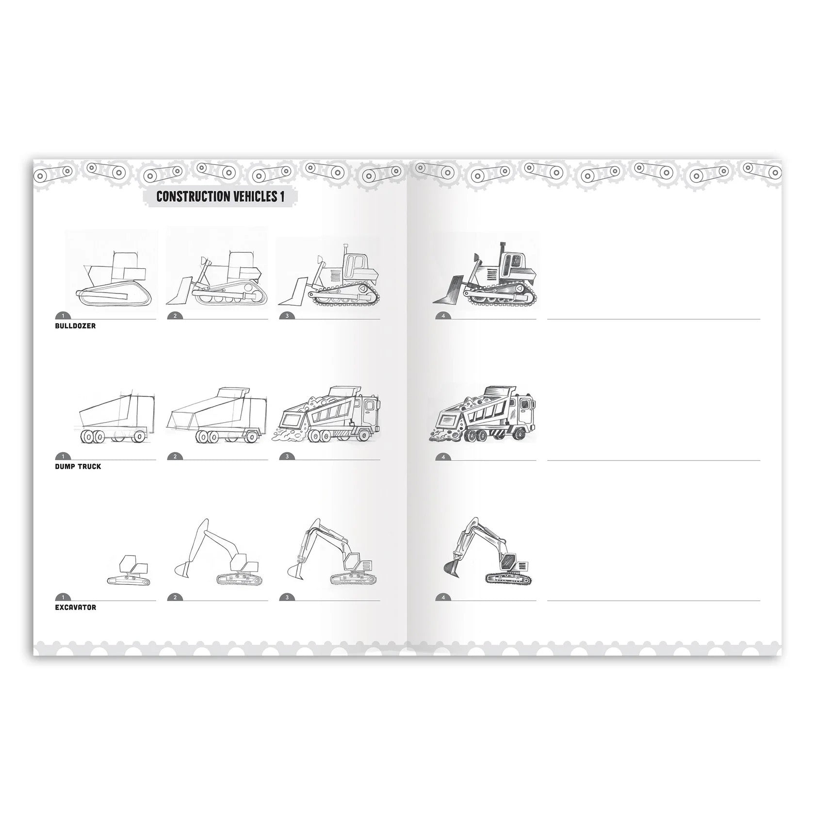 A thoughtfully designed introduction to drawing “things that go” in sequential steps. Sections are organized by transportation type, each ending with a two-page landscape spread for you to populate with the trains, cars, boats, and flying machines you have learned to draw!