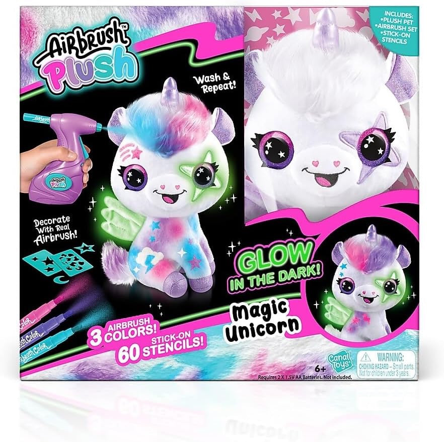 Create your own luminescent unicorn plush using this airbrush kit. Comes with plush pet, airbrush set, and stick-on stencils.