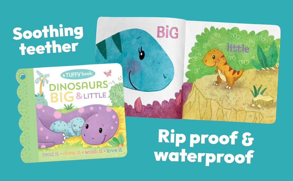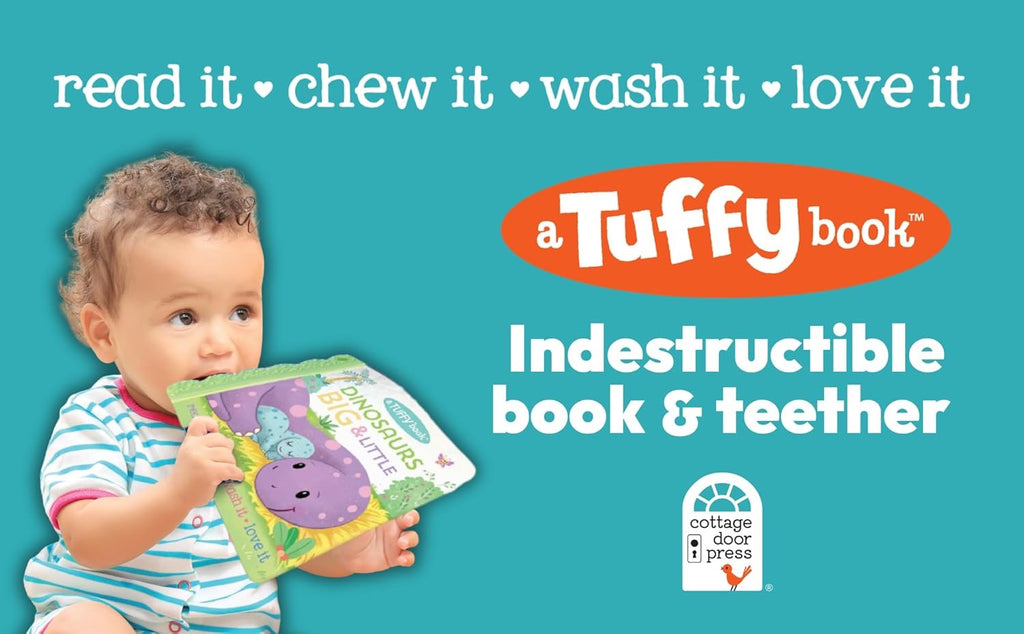 Take your little one through a world of dino-sized discovery! Dinosaurs Big & Little is a chewable book that’s more than just a story—it’s a durable, chew-safe toy designed especially for little hands and teething mouths. Explore early opposites like big & little, up & down, and in & out with friendly dinosaur favorites. Made with soft, safety-sewn, BPA-free material, this indestructible book is built to be chewed, bent, hugged, and loved—without ever ripping or tearing. Read-It, Chew-It, Wash-It, and Love-It! That’s the Tuffy way.