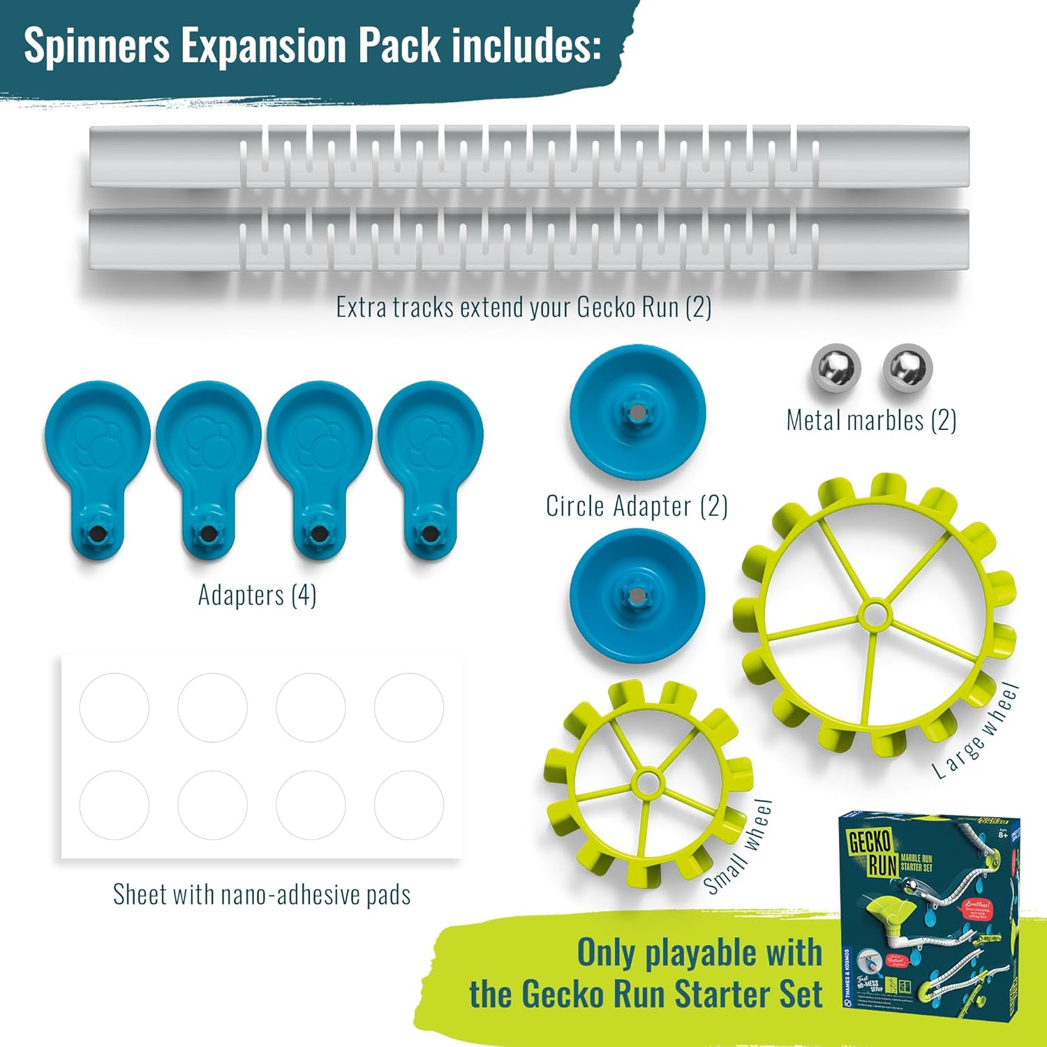 • What's included: The Spinners Expansion Pack comes with over a dozen parts to complement the Gecko Run Starter Set, including two gear wheels to add some spinning action to your marble run--use them individually or together for surprising effects! Also comes with two additional tracks, marbles, and nano-adhesive pads.