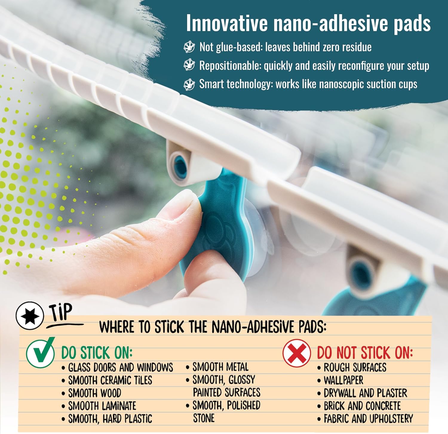 • Intuitive & Mess-free: Tracks attach to smooth surfaces with the help of clever nano-adhesive pads that create a strong but temporary bond; the pads are not glue-based and can be quickly and easily repositioned without leaving behind damage or sticky residue.