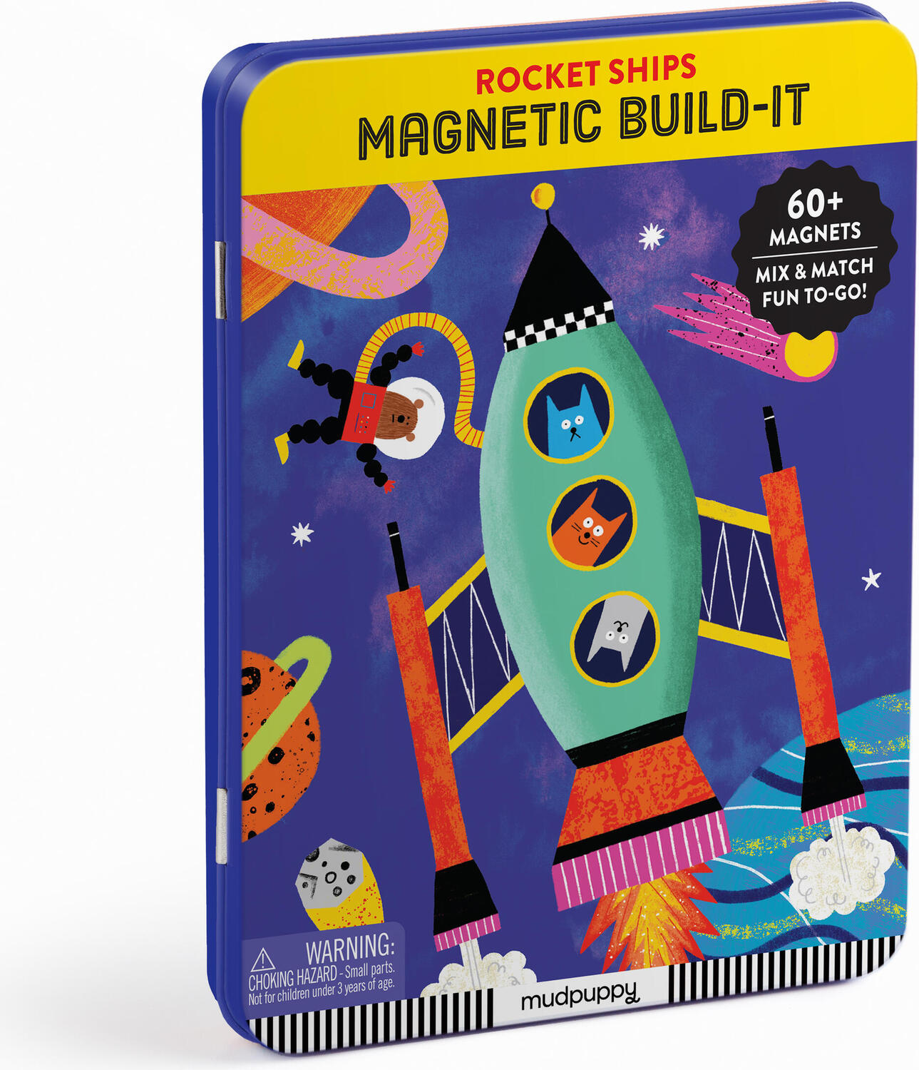 Mudpuppy's Rocket Ships Magnetic Build-it includes 2 illustrated scenes and 3 sheets of mix and match magnets for creating your own galactic spacecraft! The sturdy tin package offers hours of imaginative play with easy cleanup and storage of pieces. Mudpuppy's Magnetic Tins are the perfect children's travel toy and quiet time activity.