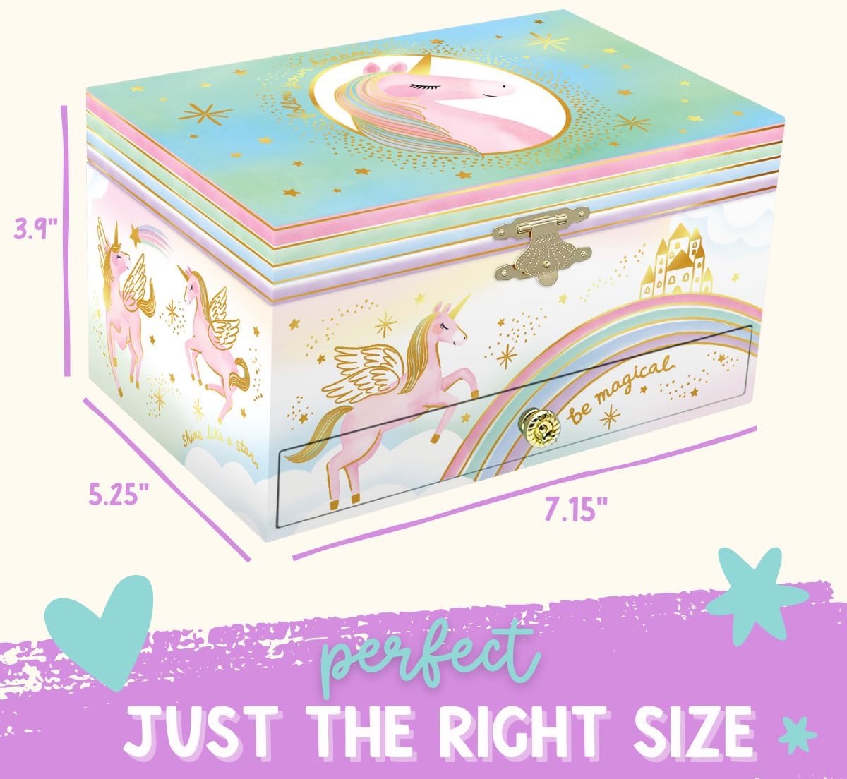 • Fine Craftsmanship - Made with sturdy pine fiberboard & tested for safety, this jewelry box for kids is built to last. The spinning unicorn music box for girls complies with all CPSIA, ASTM, and EN71 guidelines ensuring the wellbeing of any child