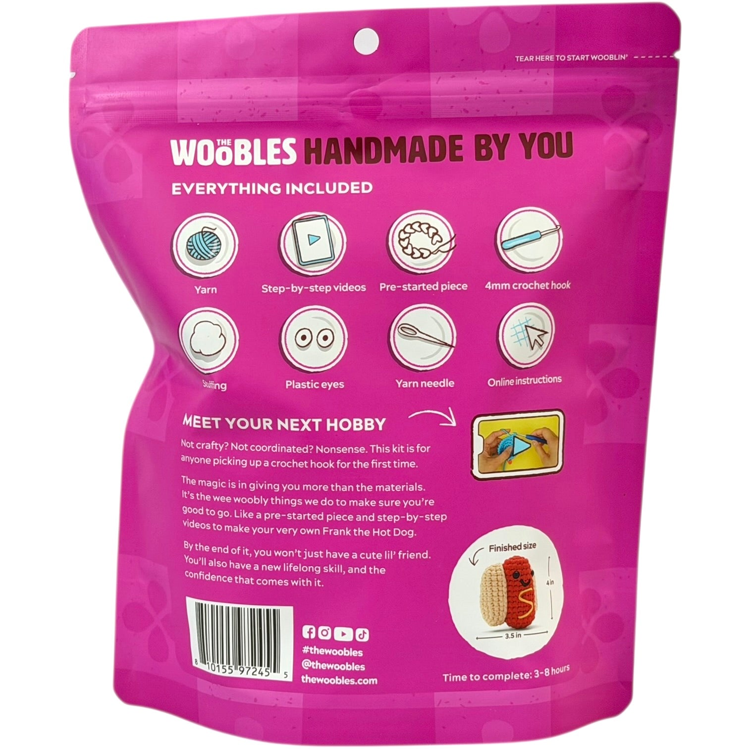 You may think that Frank’s bun-derful bun and yellow-mazing squirt of mustard look a wee bit tricky. But our simple step-by-step videos make it easy to mustard up the courage to begin—as well as to ketchup if you fall behind. Plus since snarls are the wurst, we’ve included plenty of Easy Peasy Yarn™ to keep you snag-free. Hot diggity dog—let’s do this!