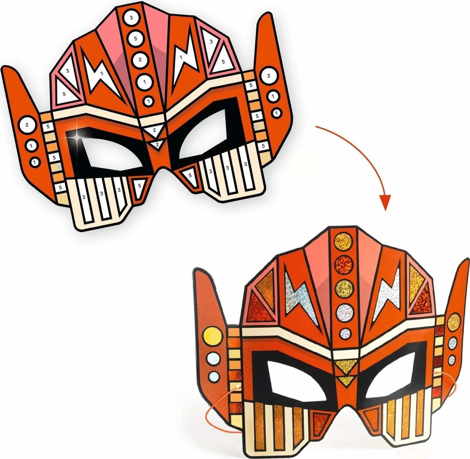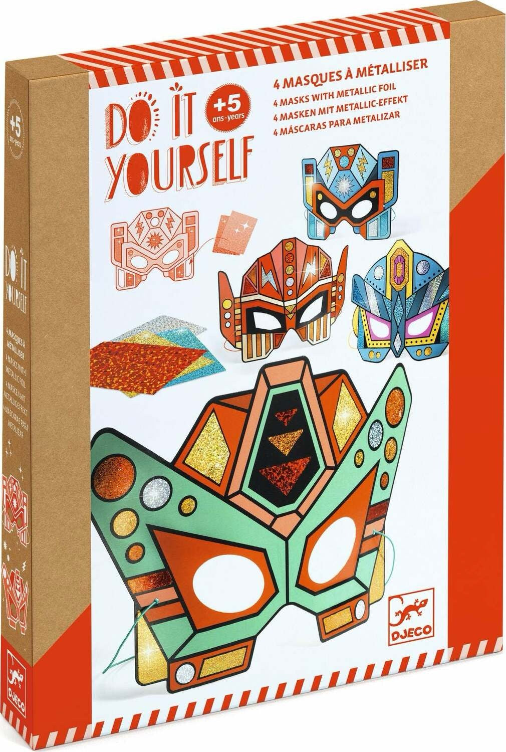 A creative kit to create 4 Super Robots masks with metallic details. Thanks to the adhesive areas on the masks, you can place the foil on top following the numbers shown in the step-by-step instructions. The material settles like magic and the masks gleam with metallic sparkles for the most beautiful effect!