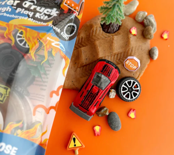 Includes 8 oz Textured Brown (Root Beer) KidDough, Monster Truck, Tires, Tree, road signs, drive-through ring of fire, jar of fire fimos, crash car, and Natural Rocks.