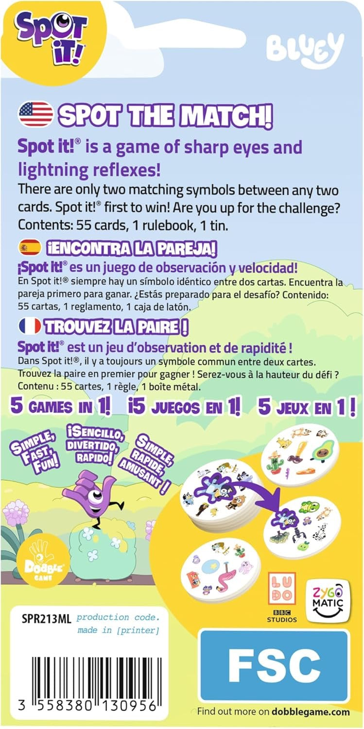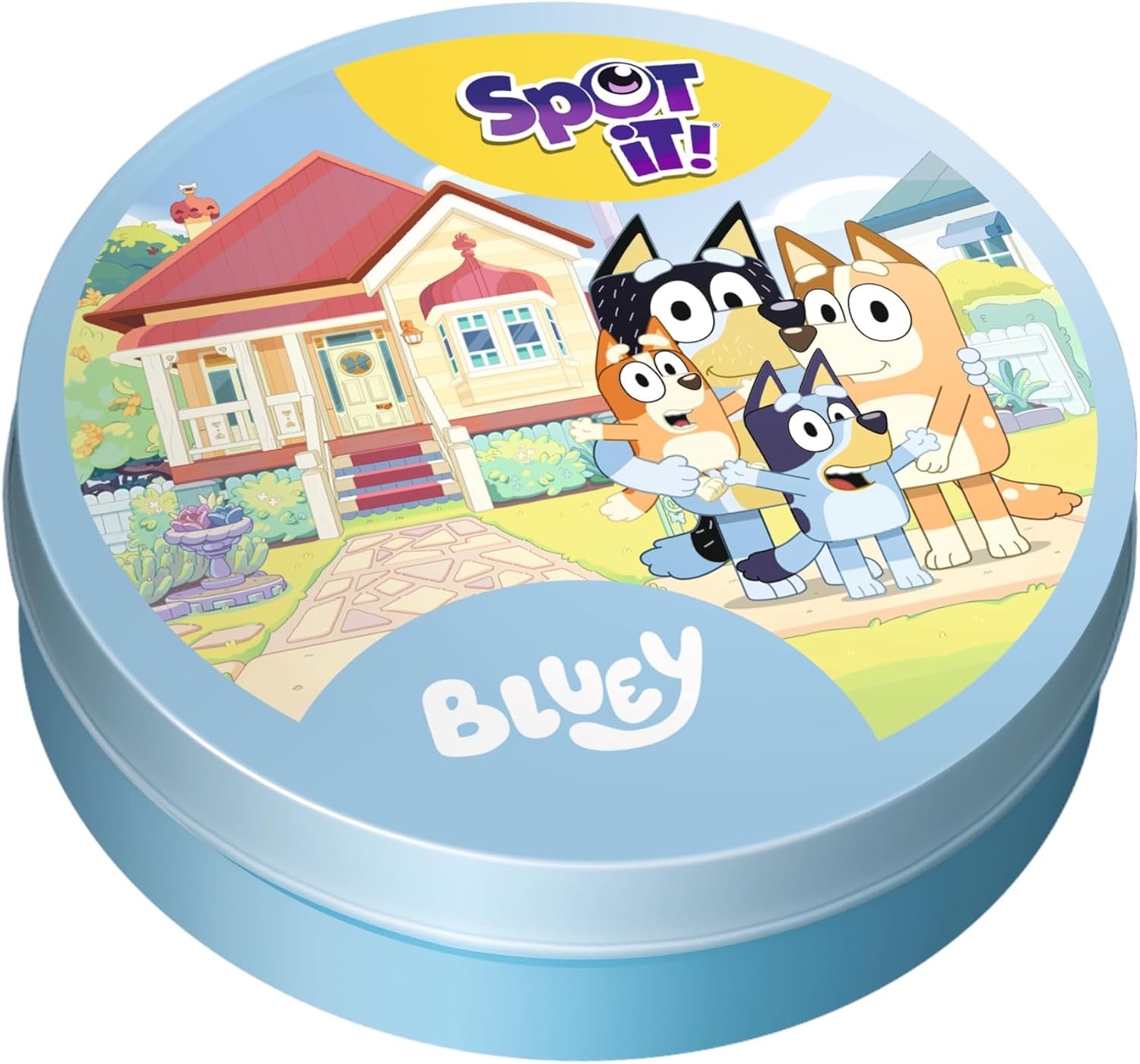 This fast-paced fun family game of observation and quick reflexes is ideal for players aged 4 and up. Be the first to spot the only matching Bluey character symbols between two cards to win! Spot some of your favorite Bluey Characters like Bluey, Bingo, Chilli, Bandit, and more. Cards come in a keep safe "Spot It!" tin. Includes 55 playing cards and is a great game for 2-8 players, making it the perfect party game!
