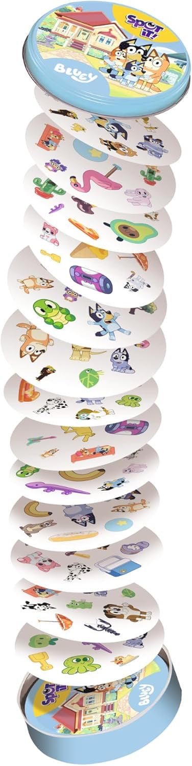 The Bluey edition of Spot It! comes packaged in a handy tin containing 55 beautifully illustrated cards.