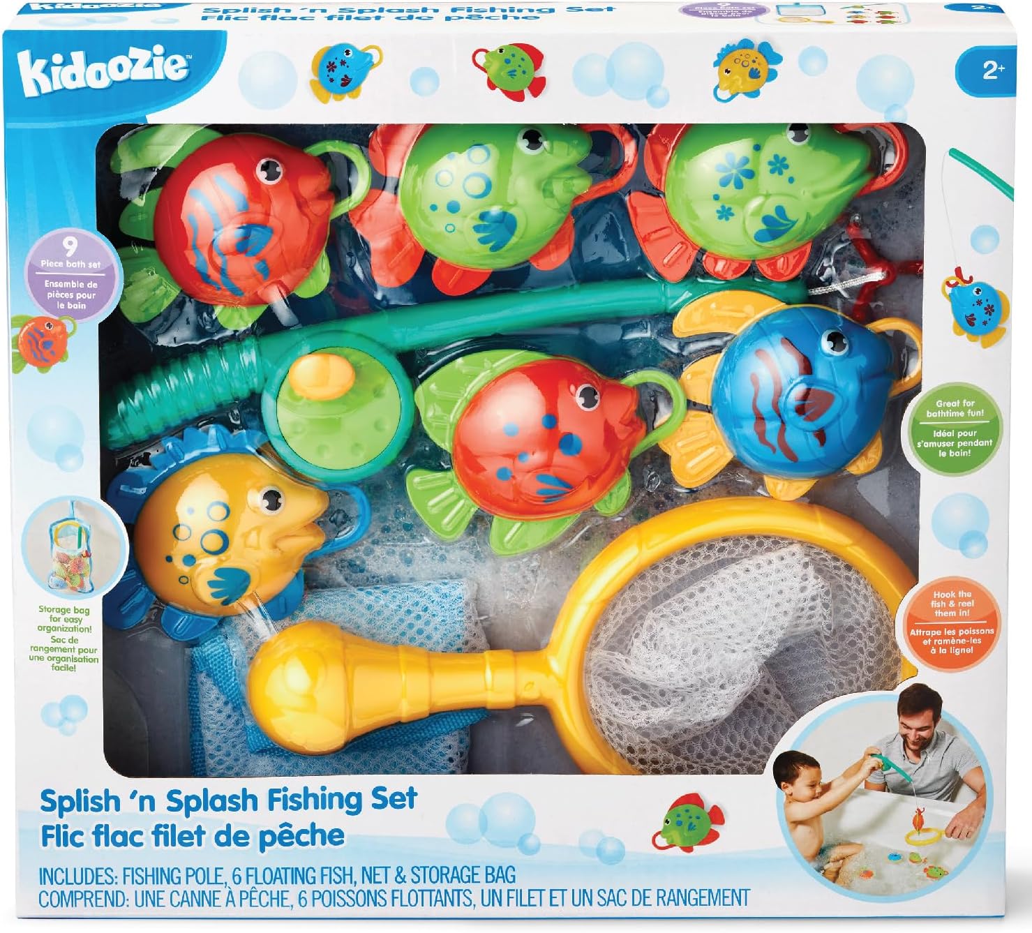 • SPIN 'N PLAY: It's time to cast your pole and catch some fish with the Kidoozie Splish 'n Splash Fishing set. Use the fishing pole to hook one of the six floating fish and then reel them in! Otherwise use the net to scoop them up as they float around in the bath.