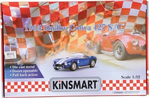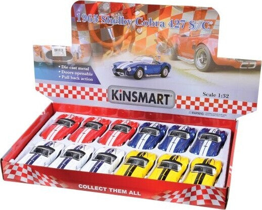 Die cast model shelby cobra with racing stripes. Pull back action with opening doors. Made of metal and plastic. Item 5" L. x 2" W. x 2" T., 1:36 Scale replica.