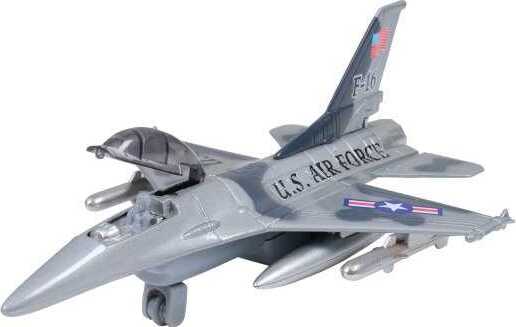 Cockpit door on this fighter jet opens to reveal a small pilot. Pull back action. Made of metal and plastic. Item 7" L. x 6" W. x 3" T.