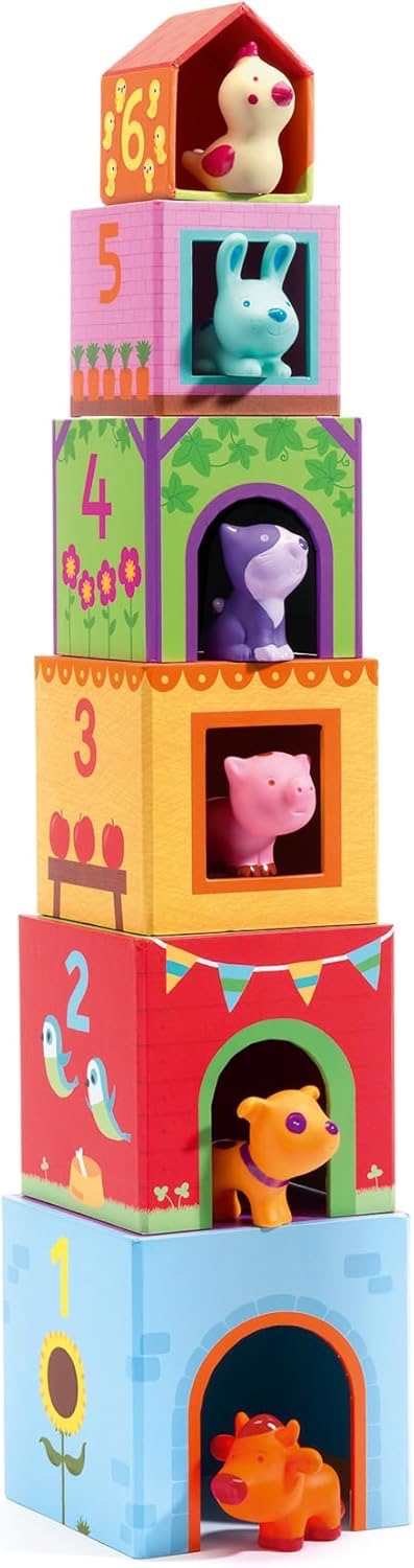 • Build a beautiful farm with this fibre-board blocks and tower set, includes 6 nesting boxes and 6 whimsical farm animals