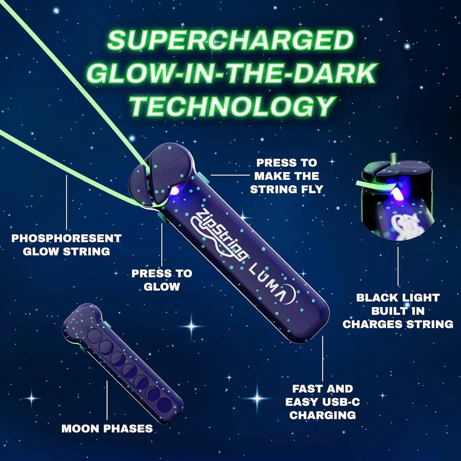 ZipString Luma comes with 5 strings with different lengths and colors. Luma’s built-in LED charges the ultra glow string for endless glow. Create shapes and tricks in the light and at night!