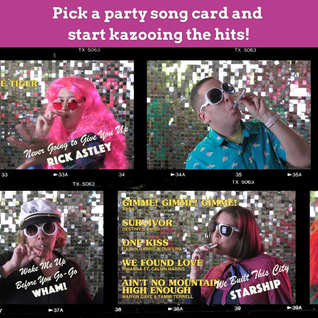 • 🪩 NO TALENT NEEDED – Remember, it’s just kazoo-ing; there’s no singing involved! So long as you’ve been to a few parties, listened to the radio, or even hit the clubs at some point, then that’s all you need to play. And if you don’t know a song, then pass!