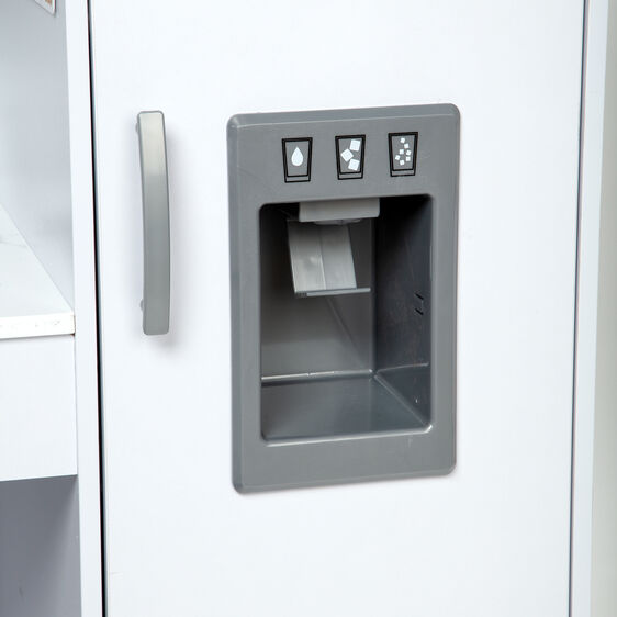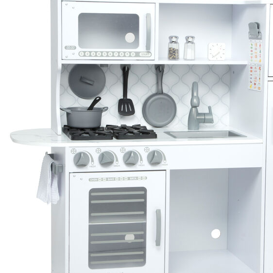 Budding young chefs can hone their craft in this beautifully designed, white marble-colored modern play kitchen! The easy to assemble chef's kitchen includes a refrigerator/freezer with innovative working ice maker that dispenses two included "ice cubes," an oven and stovetop with dials that turn, microwave with turning plate, sink with moving faucet and handle, grocery check list, movable hooks, and ample shelving and storage for easy cleanup. Detailed, illustrated instructions make this kitchen simple to put together. Assembled, it stands approximately 3.5 feet (1 meter) long and more than three feet (0.9 meters) high, roomy enough for multiple kids to play at once. Sturdy, top-quality wooden construction means it will stand up to years of creative make-believe meal-making!