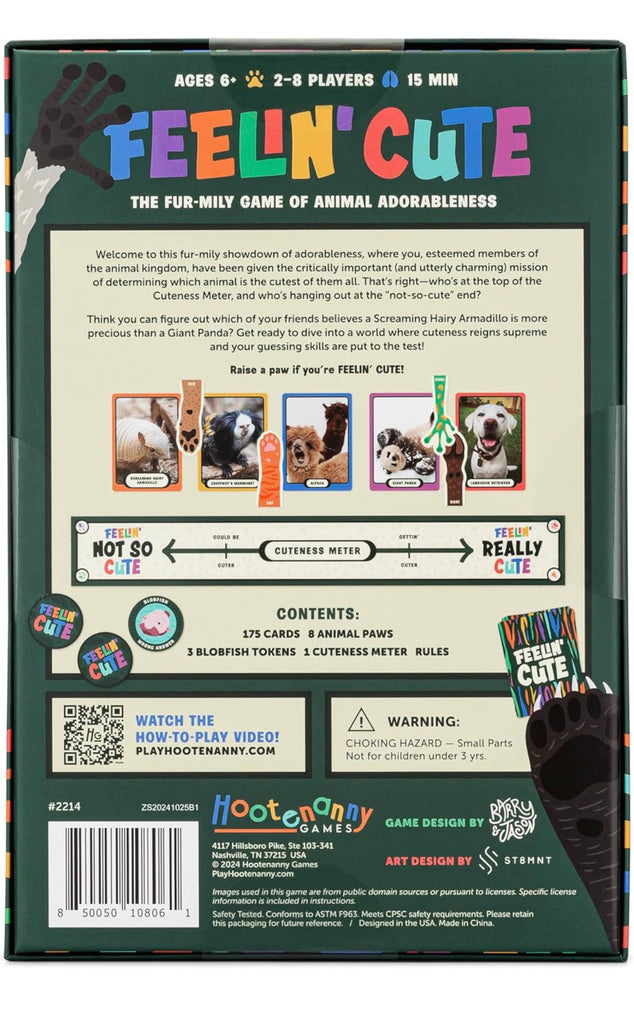 • FEELIN’ CUTE is the fur-mily party game of determining which animals are the cutest! Think you can figure out which of your friends believes a Tree Frog is more precious than a Fennec Fox? You’re about to!