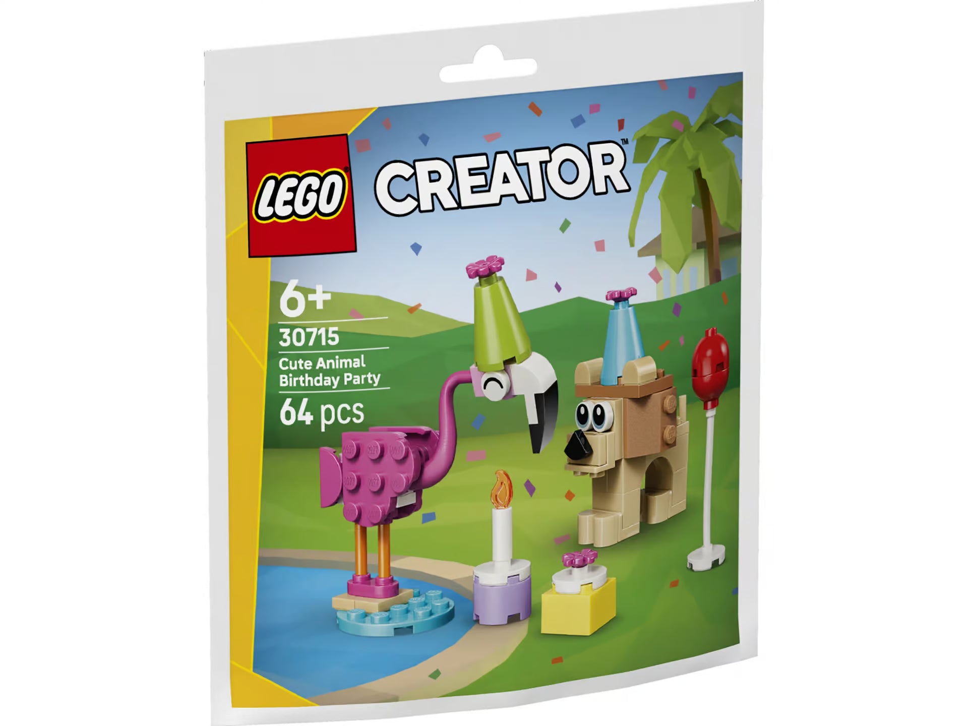 Bring some cuteness to birthday celebrations with this animal playset featuring a flamingo and a lion wearing party hats, with a balloon, a present and a birthday cake.
