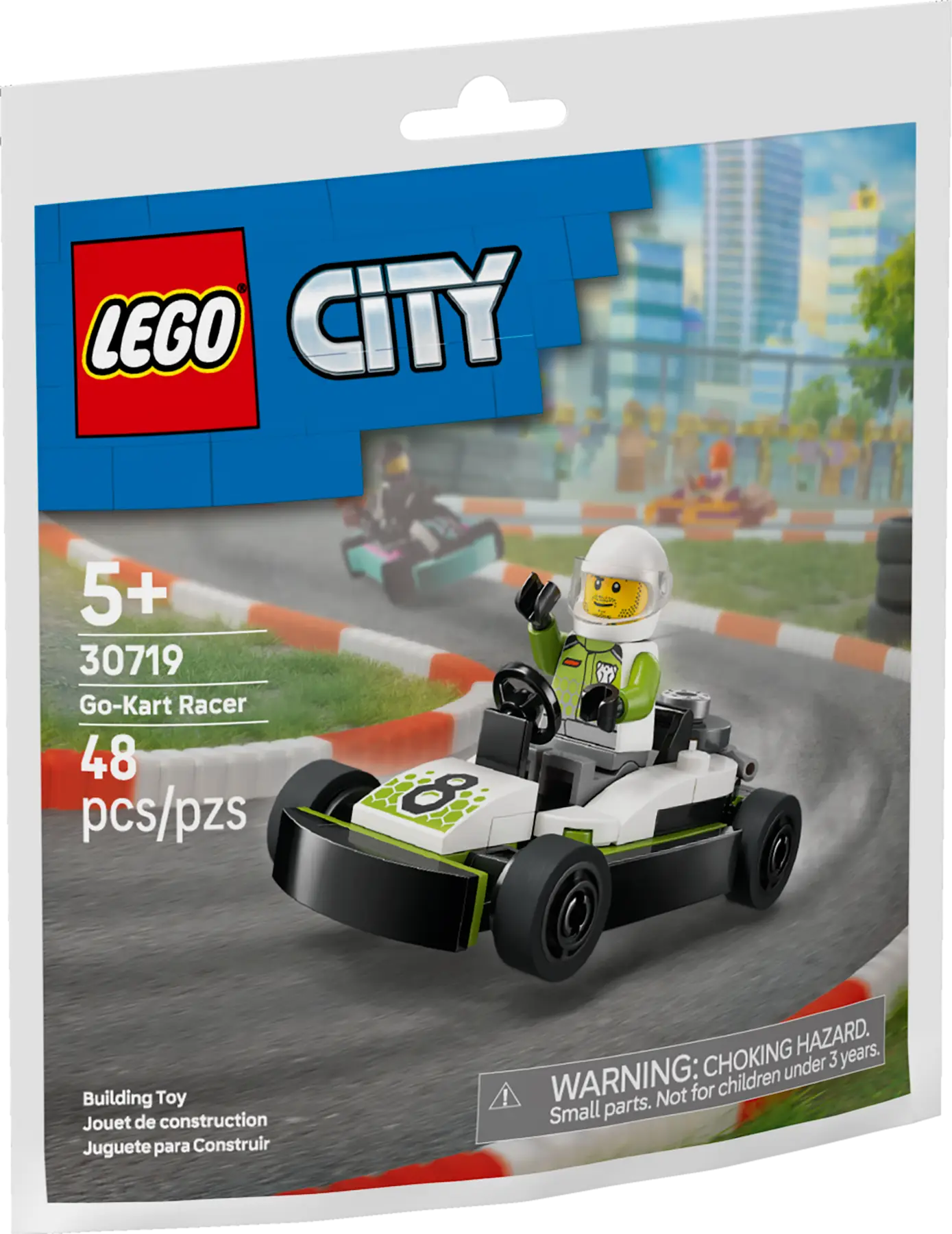 Fuel high-speed creative play with this LEGO® City Race Kart, featuring a low-profile racing vehicle with slick tires and a driver minifigure with a racing helmet.