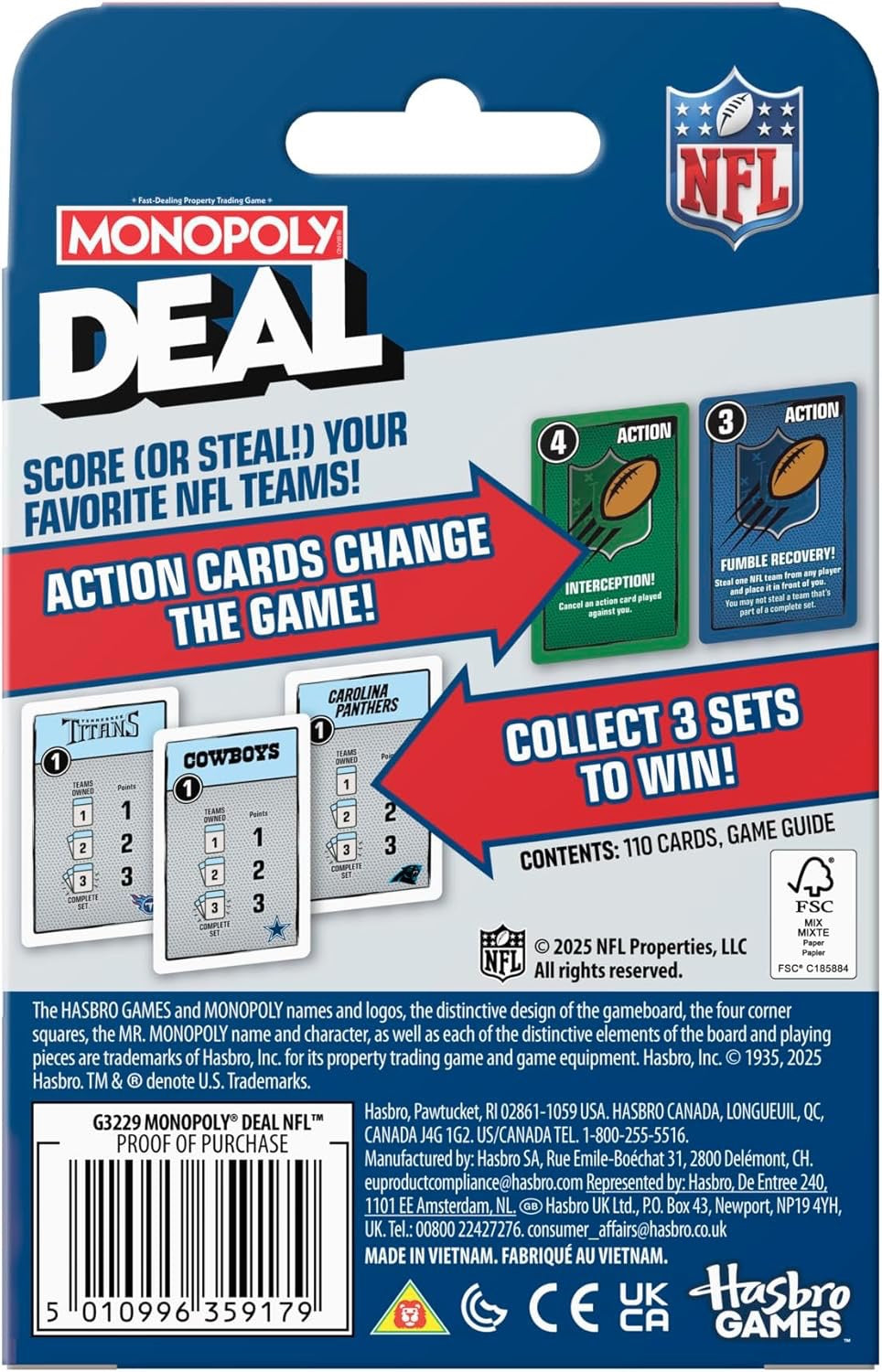 • NFL-THEMED MONOPOLY CARD GAME: A football twist on a family favorite! Compete to collect National Football League teams from across the league in the Monopoly Deal NFL Edition game. Ages 8+