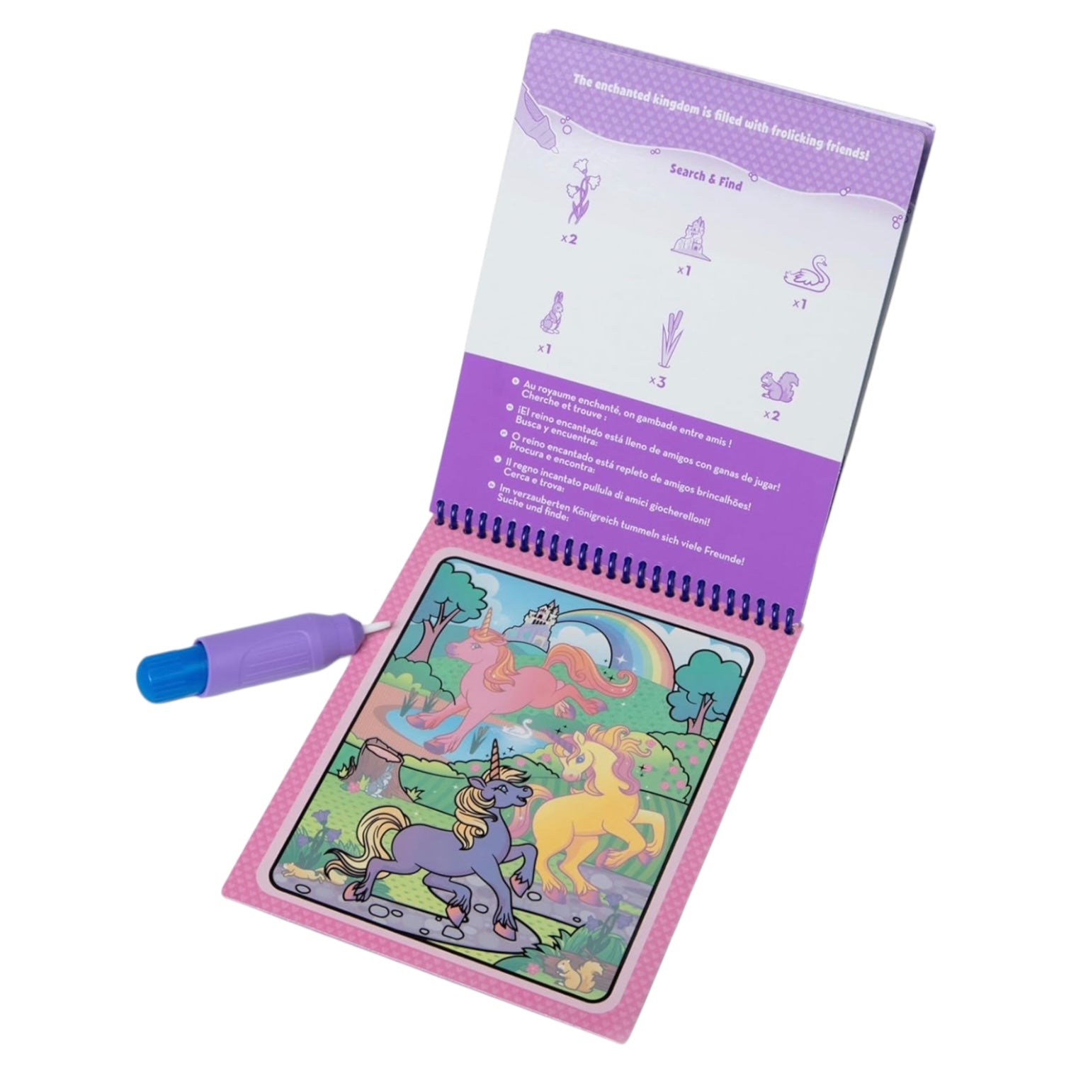 • Use the refillable chunky water pen to color with water and reveal vibrant colors on 4 unicorn-themed spiral-bound coloring boards