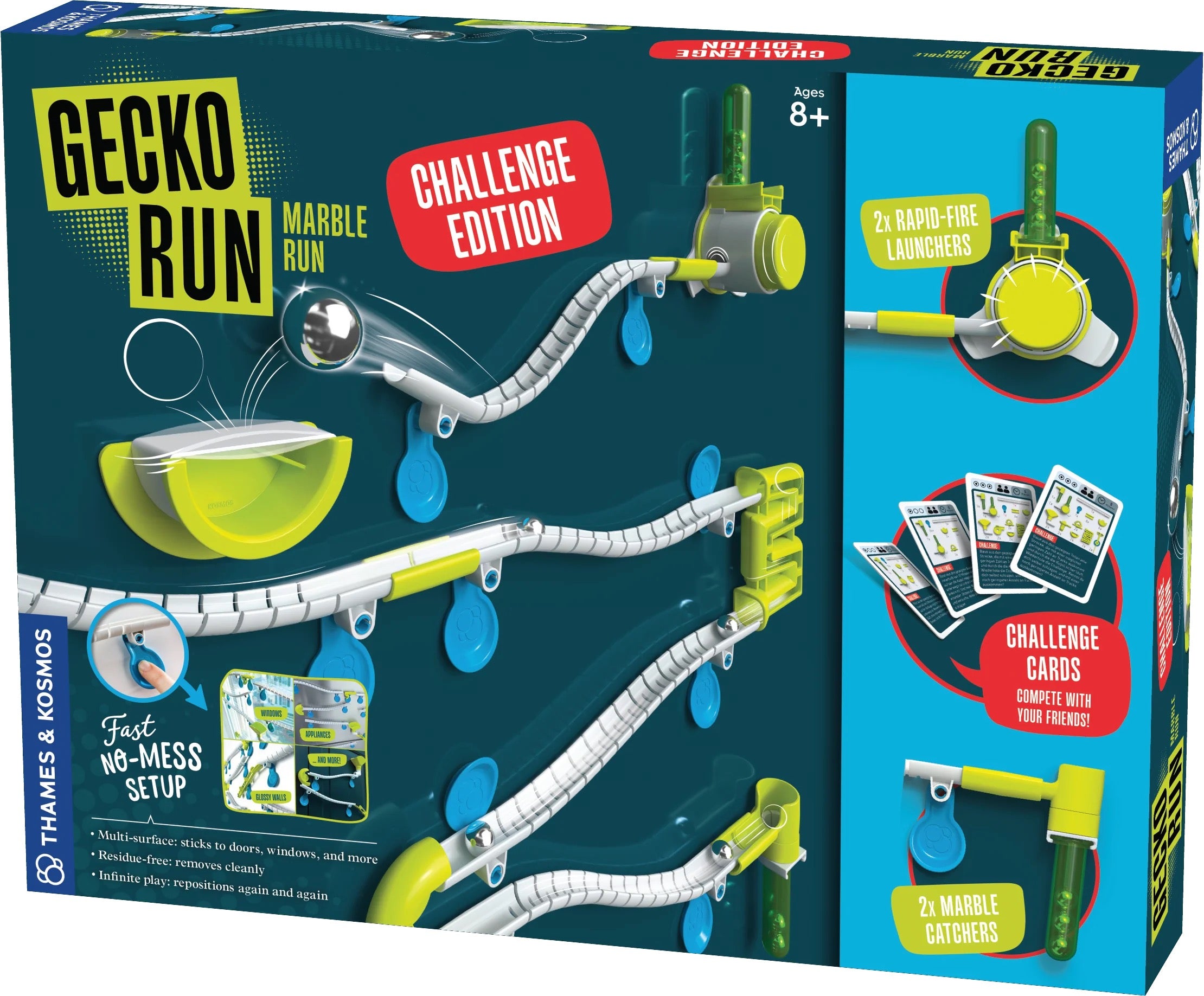 Get ready for a thrilling marble-run race with Gecko Run - Challenge Edition! This set has everything for two players or teams to build and race vertical marble runs at the same time. Use 32 fun challenge cards to try different goals like making the fastest or longest run. The kit includes launchers, parts, and a colorful guide to get you started. Play solo or team up—either way, it’s a fun way to test your building skills and have a blast!
