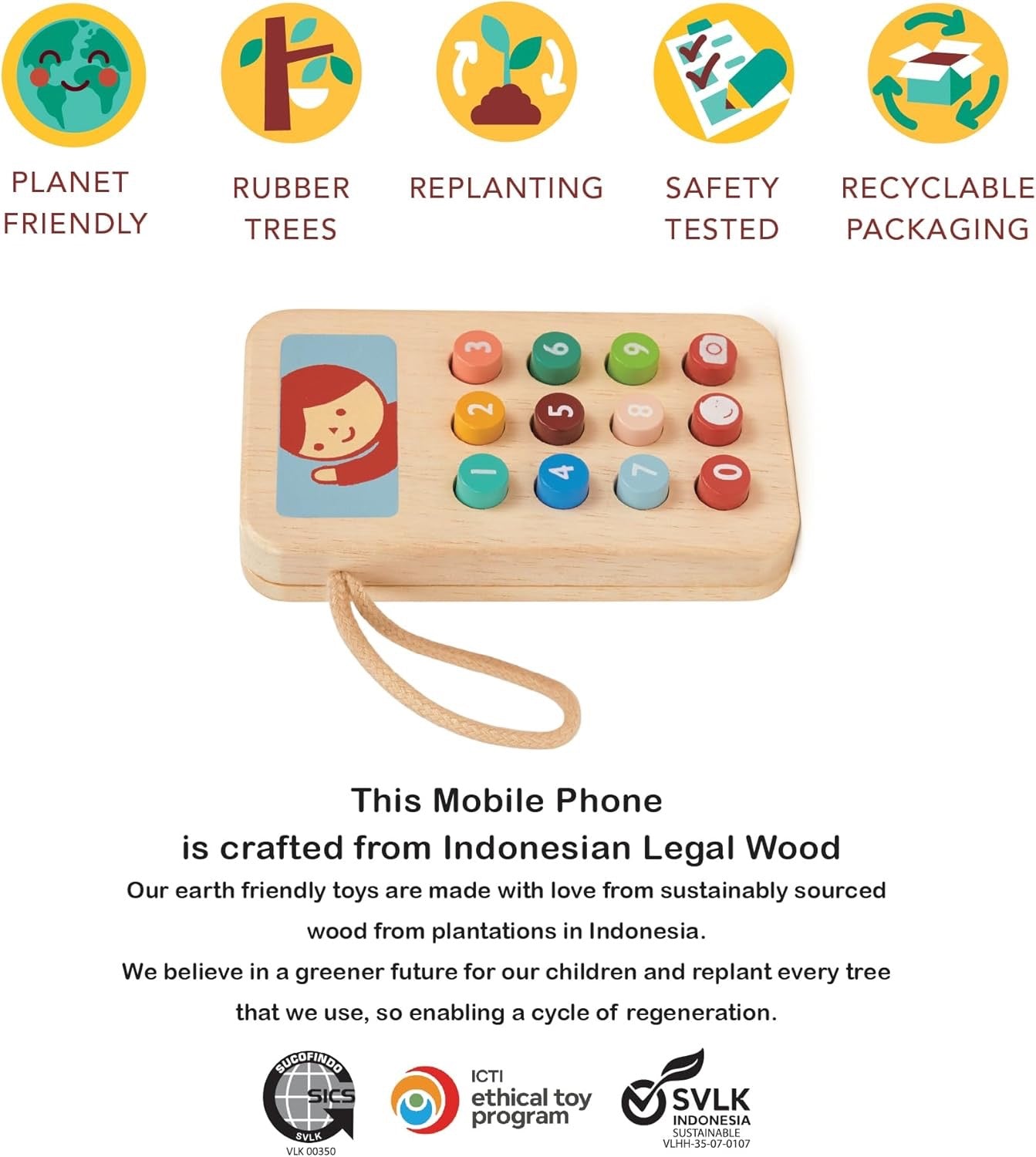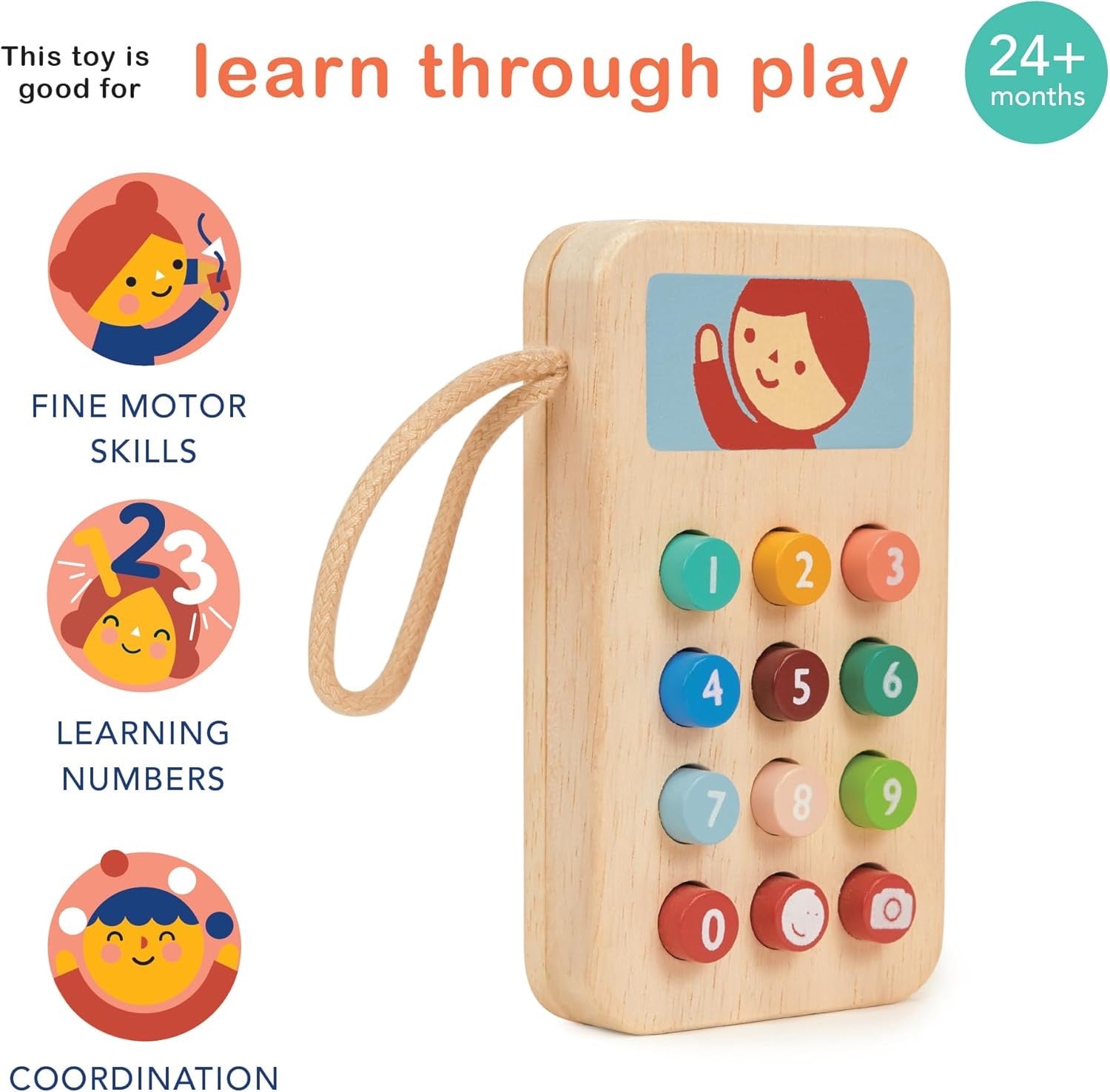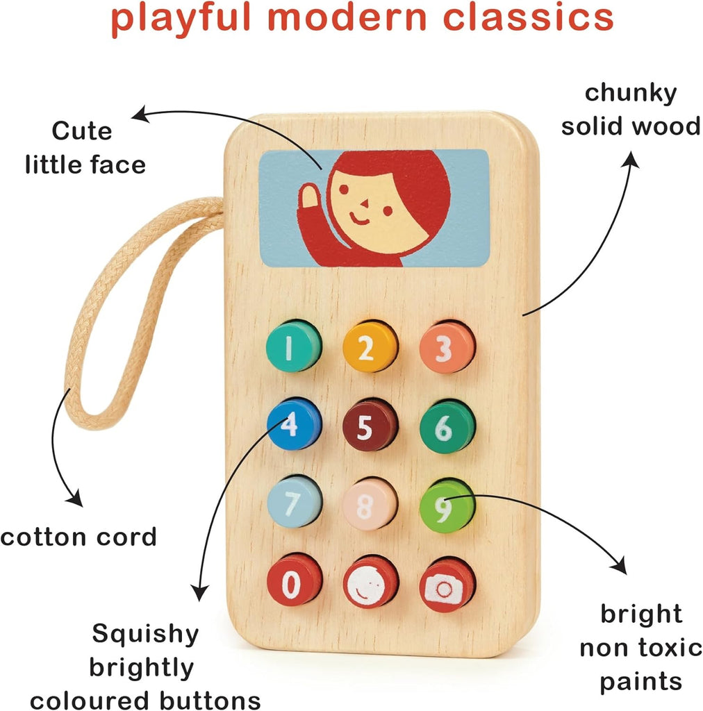 This pretend wooden mobile phone has 12 squishy coloured buttons to press and an illustrated picture. It also comes with a cord handle.