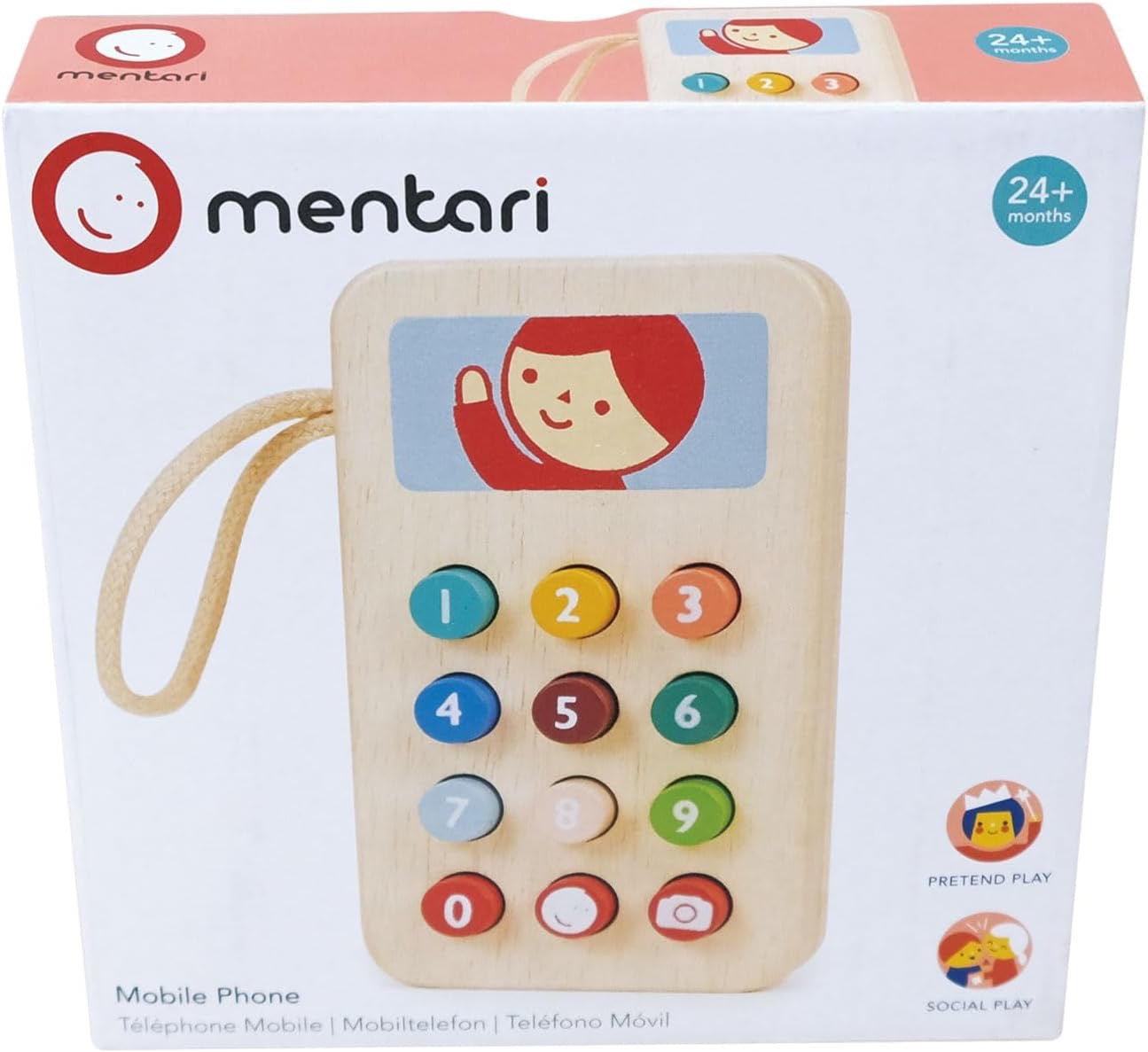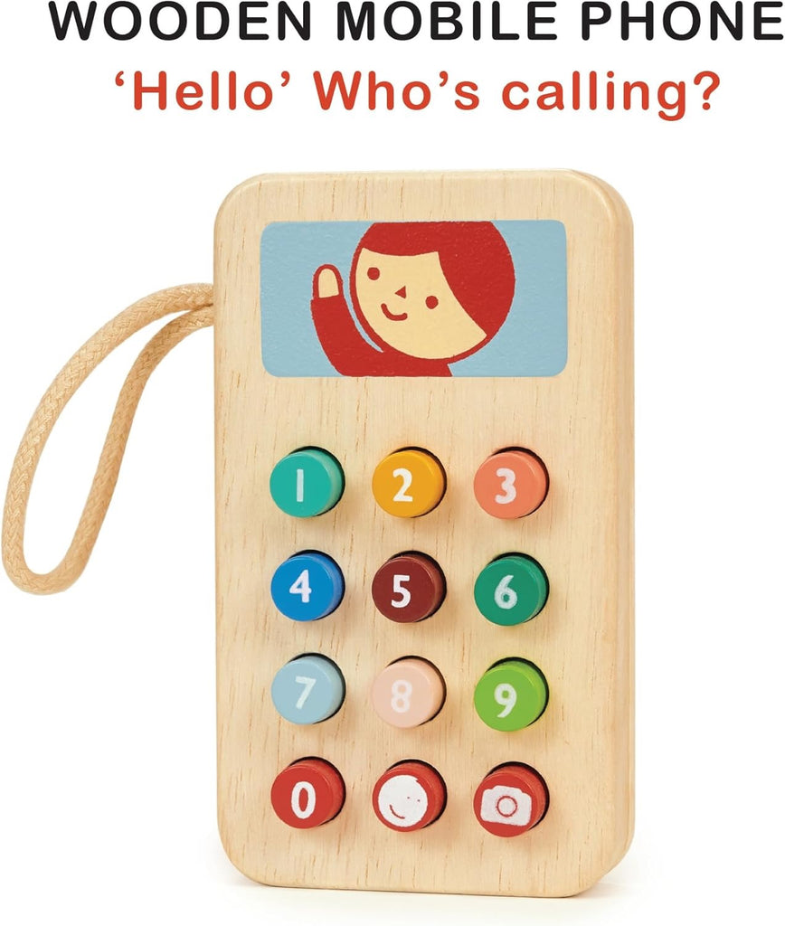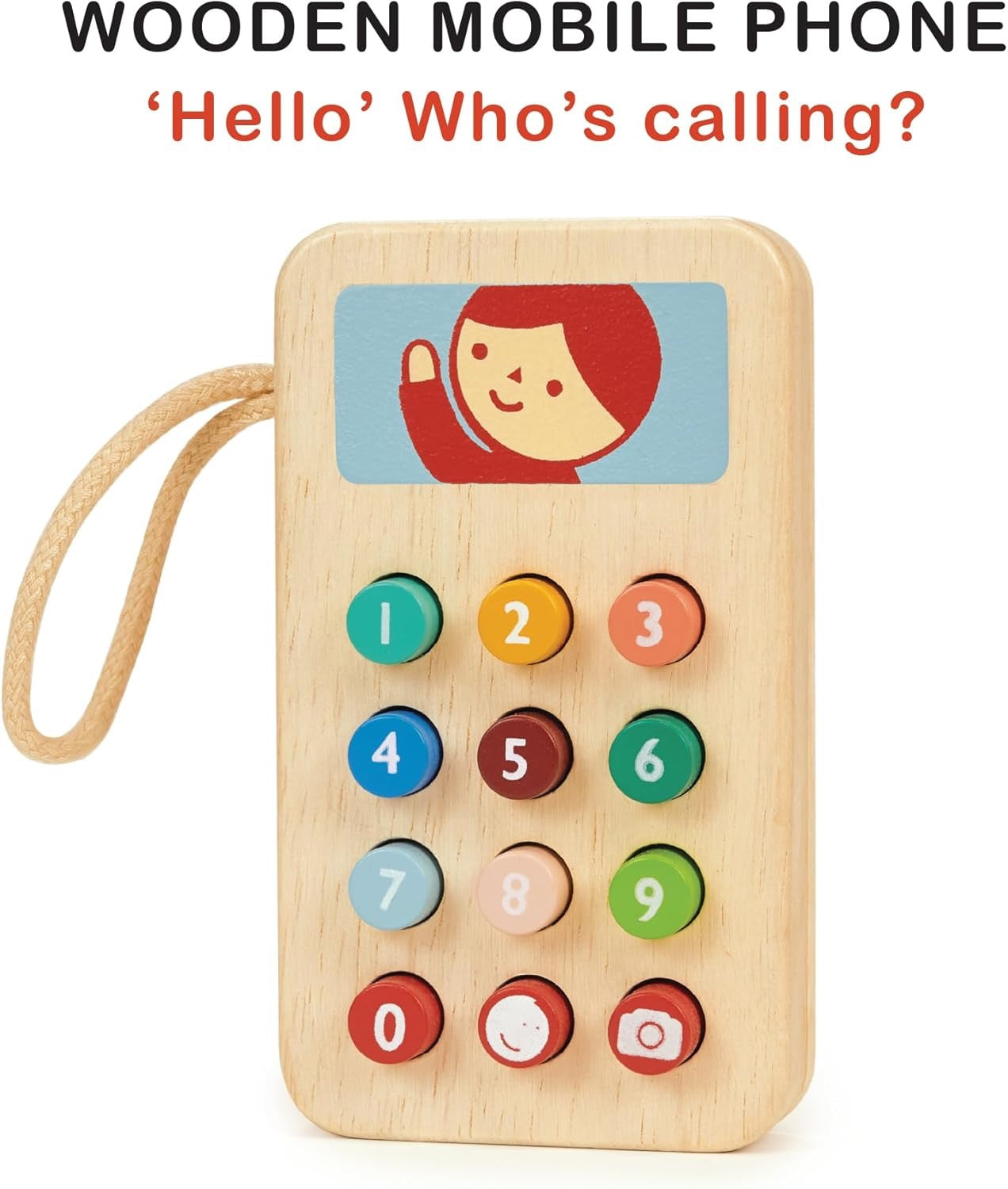 This pretend wooden mobile phone has 12 squishy coloured buttons to press and an illustrated picture. It also comes with a cord handle.