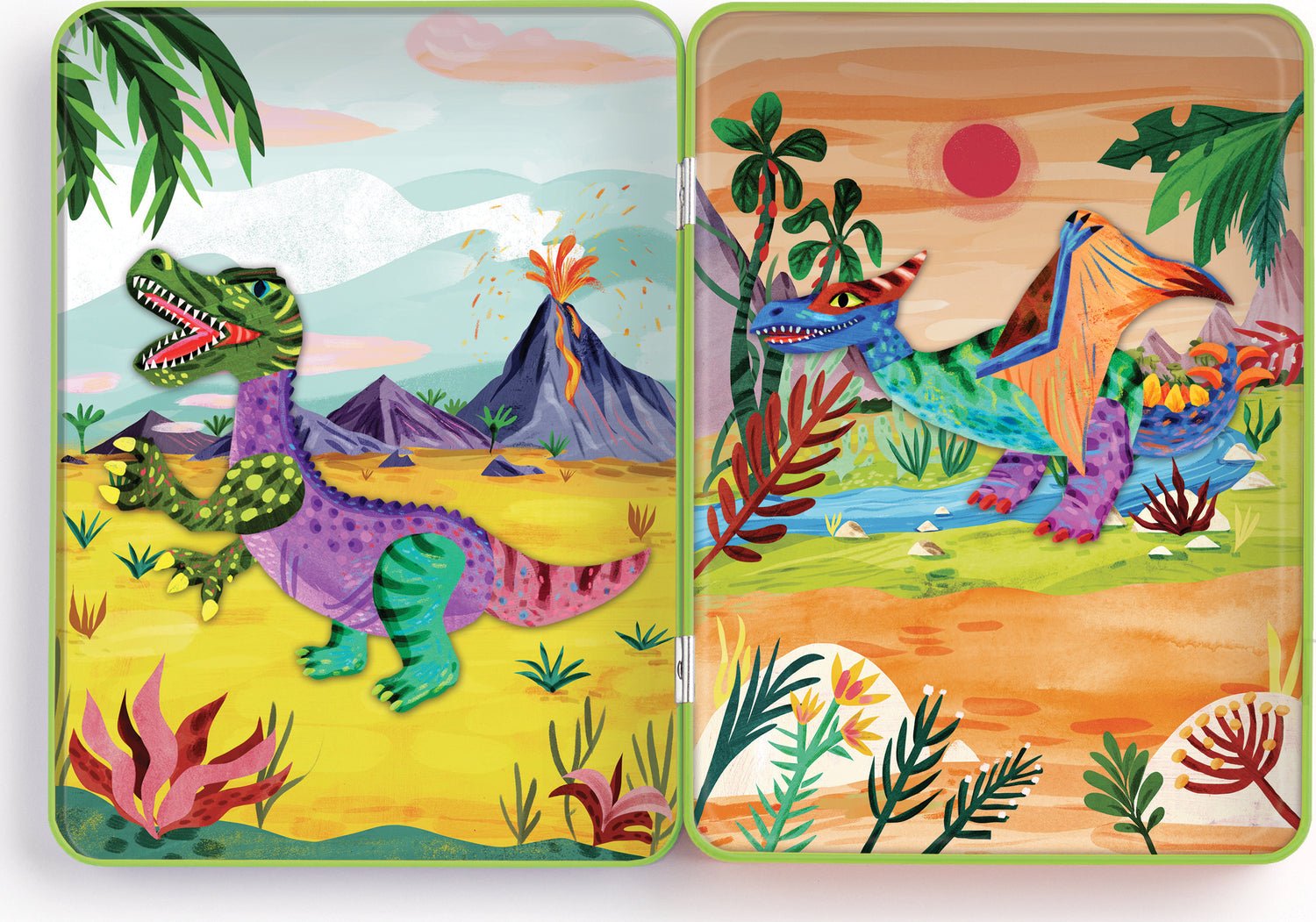 Mudpuppy's Dino Mix-Up Magnetic Build-It includes 2 colorful scenes and 3 sheets of mix and match magnets for creating your own imaginative dinosaurs. The sturdy tin package offers hours of imaginative play with easy cleanup and storage. Mudpuppy's Magnetic Tins are the perfect children's travel toy and quiet time activity.
