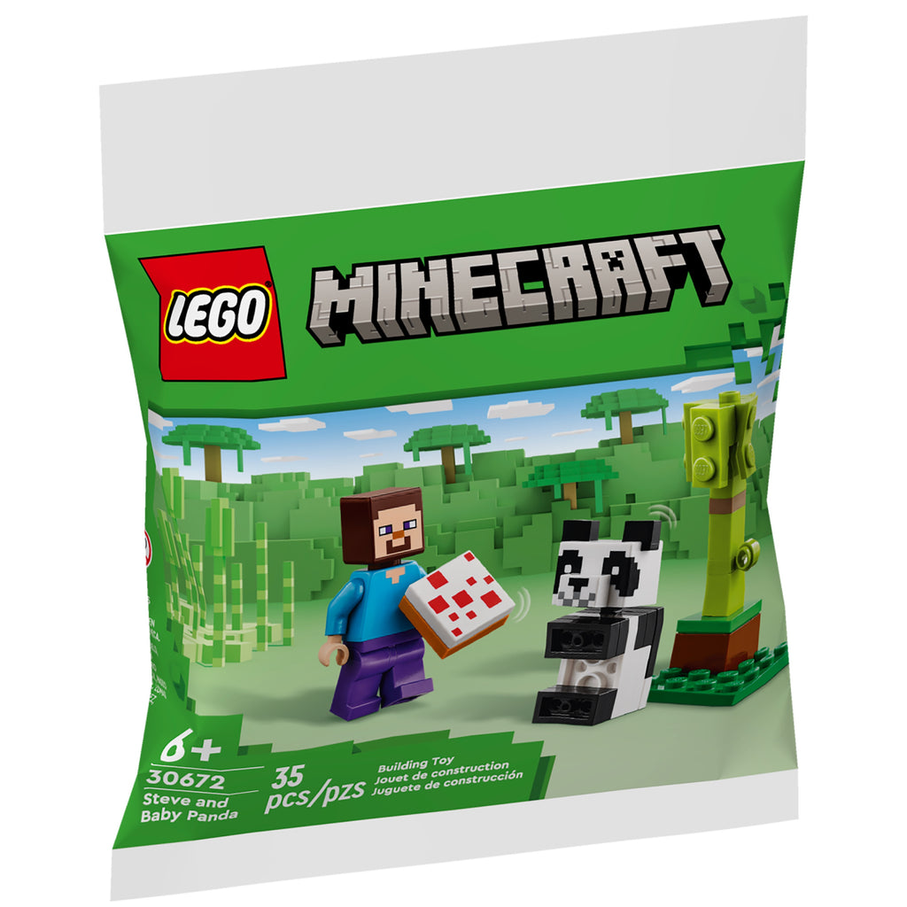 Popular Minecraft® character Steve has a cake to feed the cute baby panda. But will the panda prefer to nibble on the nearby bamboo?