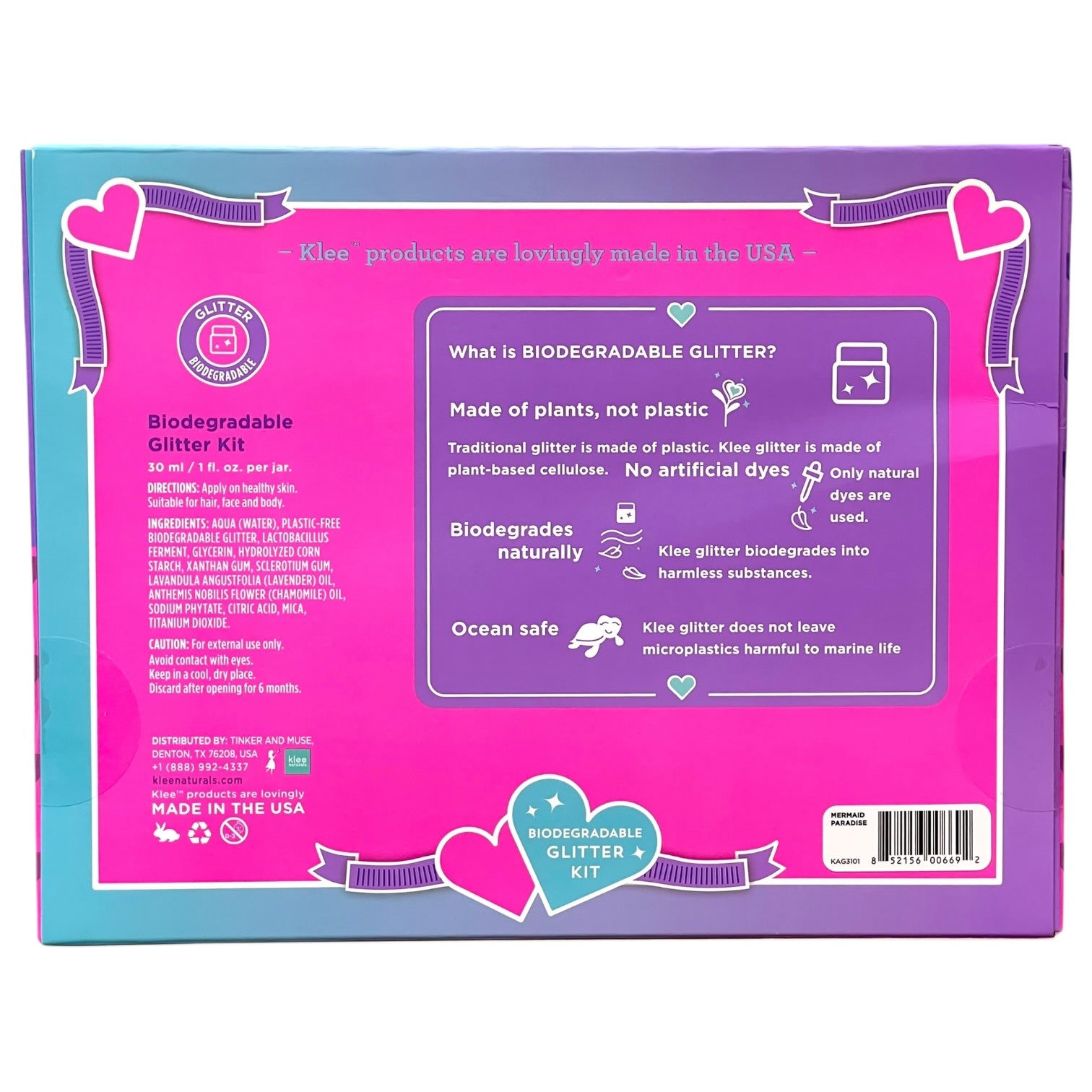 Nothing says paradise like shimmery and glittery hair and body sparkles – even better when it’s biodegradable and safe for the environment like Klee’s Mermaid Paradise bio-glitter kit! Peace out plastic glitter! Bye bye dyes! Mermaids in paradise don’t need you. The Mermaid Paradise Biodegradable Glitter kit includes four colors: Unicorn Dream, Mermaid Tails, Pink Glitterbug, and Frosted Flamingo. Life is always brighter when Klee products are involved! NO plastic, NO dyes, NO parabens, and NO synthetic fragrances. Gentle and Non-Toxic. Gluten Free. Made in USA.