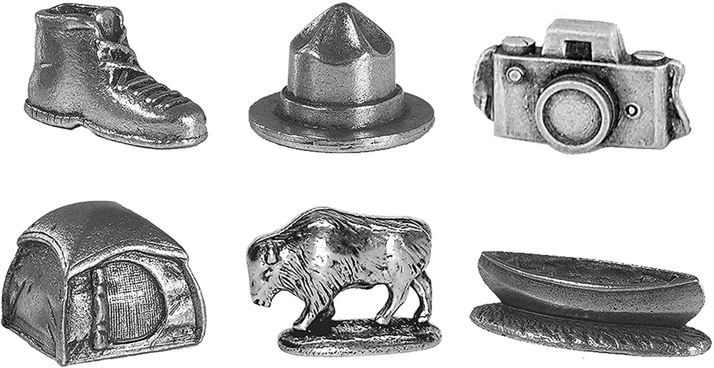 • Includes 6 custom tokens such as ranger hat, tent, canoe, bison, hiking boot and camera.