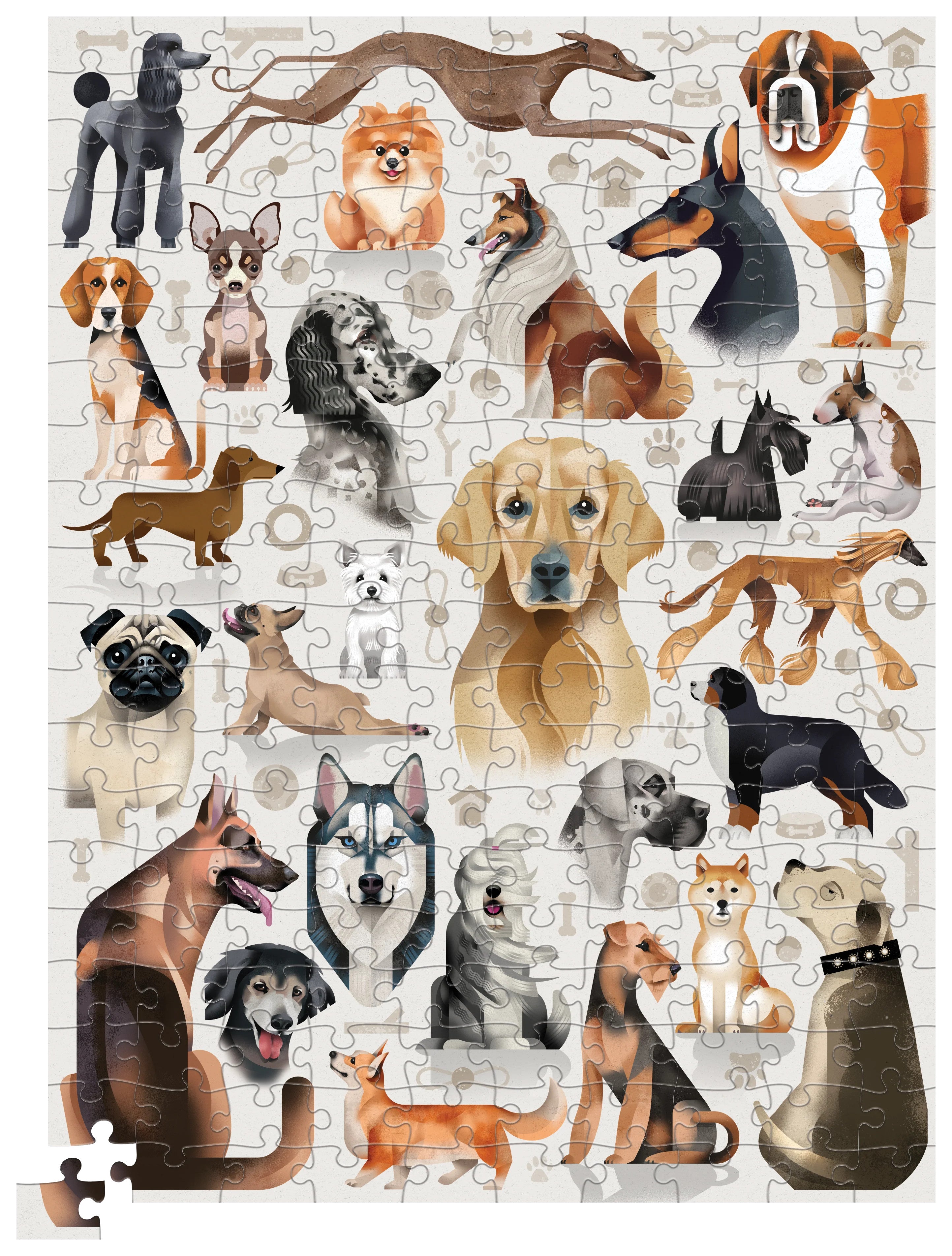 Calling all dog lovers! This charming 200-piece puzzle features a delightful collection of popular dog breeds illustrated in beautiful watercolor style. From tiny Chihuahuas to gentle giants like Great Danes, puzzle enthusiasts will enjoy identifying and assembling over 30 beloved breeds.