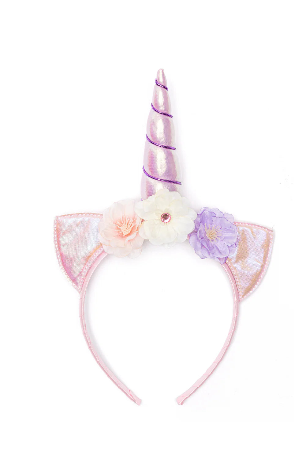 This headband is made with pink iridescent spandex, a lilac horn with three delicate faux flowers spanning the front of the headband.