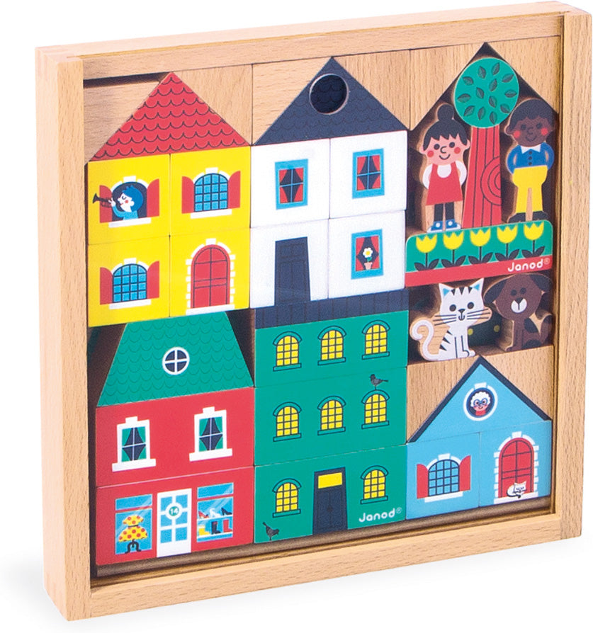 Welcome to the city, where storytelling adventures await on every corner! Encourage open-ended building with this gorgeous set of 36 wooden blocks: 25 cubes to assemble houses and buildings, 5 decorative elements, 4 people and 2 animals. Will they build a one- or two-story house? Colorful, pointed, or flat roof? Little learners develop their creativity, imagination and dexterity as they play. Combine with Janod City Play Mat for a gift that wows.