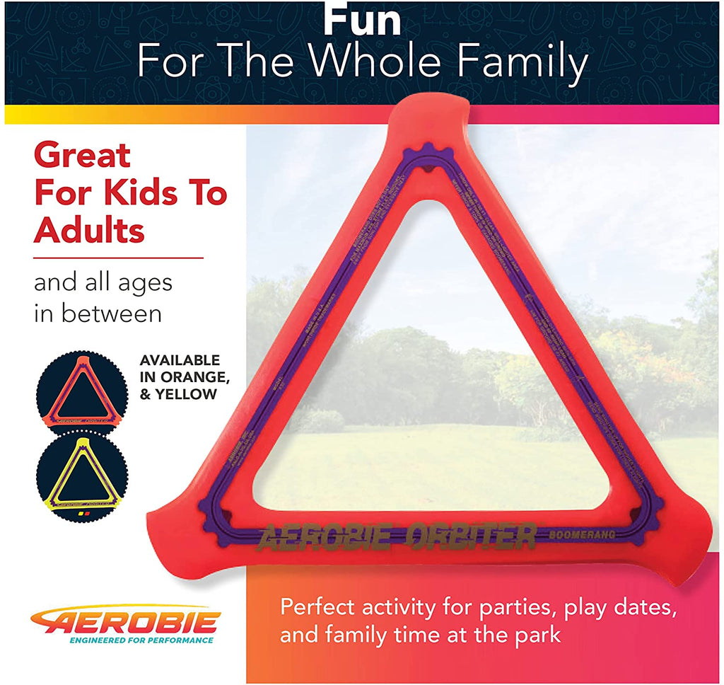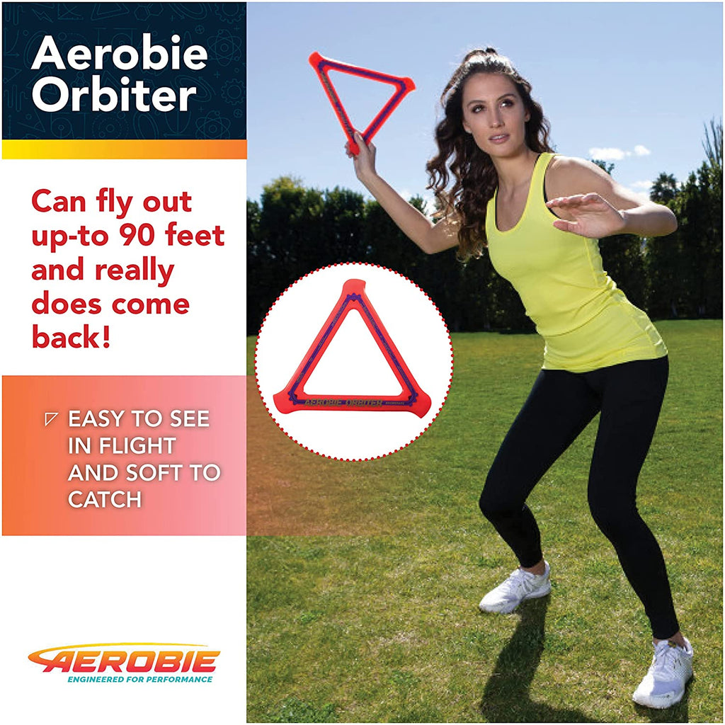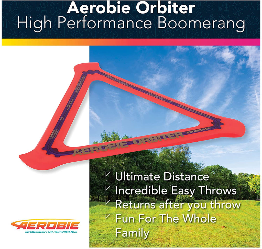 • AEROBIE ORBITER: This high performance boomerang flies out about 90 feet and really does come back; The triangular design and brightly colored soft rubber edge make it easy to see in flight and soft to catch