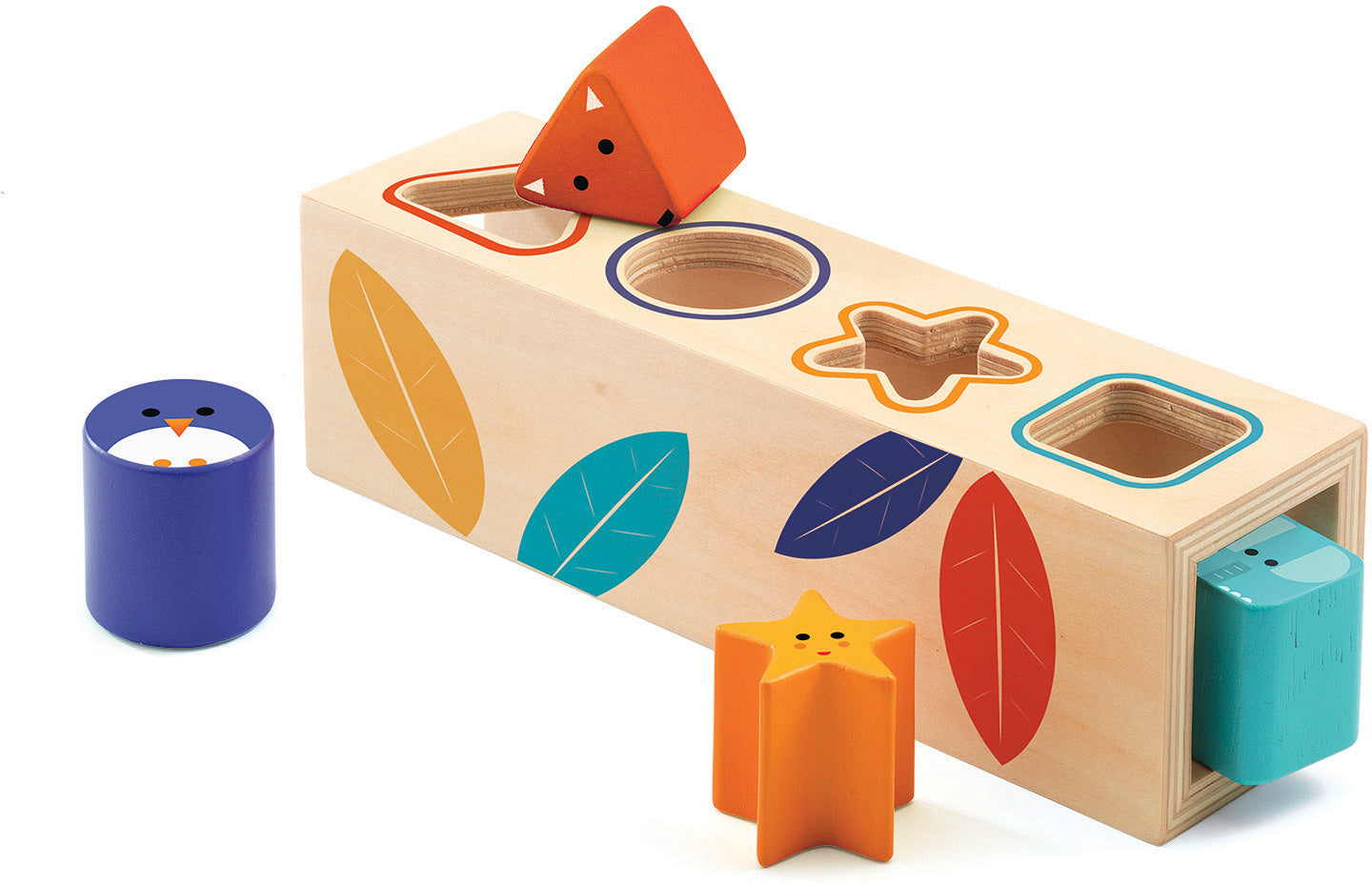 A classic wooden shape sorter; match the right shape to its corresponding hole and drop it in. Triangle, circle, star and square; match the shapes and colors and get them all in the right place. Builds motor skills, color and shape matching and spatial re