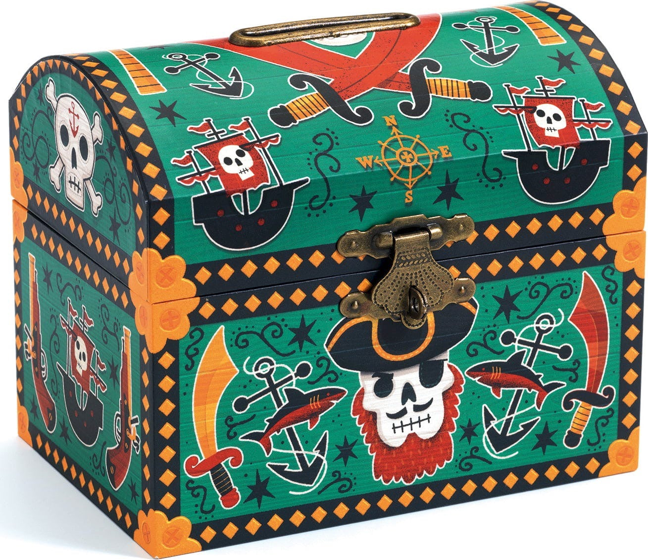 Perfect to keep your plundered treasure safe. This wooden treasure chest piggy bank has space for many golden doubloons. The slot is reinforced with a metal edge for safety and durability. As the captain, you have two keys for the padlock.