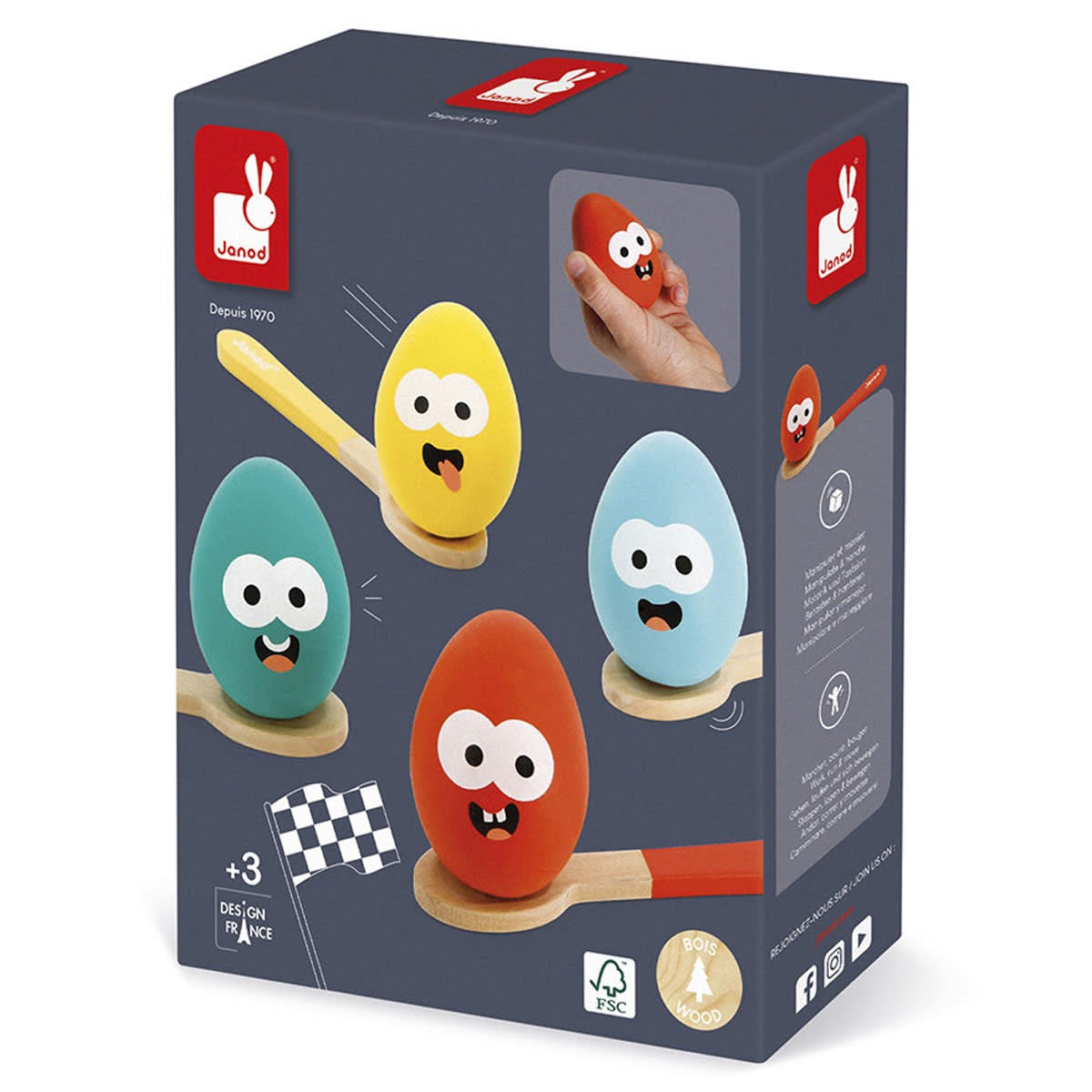 The race is on! A wonderful option for backyard fun, birthday parties, and more, this egg-and-spoon-race set encourages open-ended gross-motor play that builds balance and hand-eye coordination. Balance the wooden eggs on the spoons and race your friends! Each egg features a different color and facial expression. The eggs are fairly big for little hands, making them easy to handle. This set does not come with specific game rules, as egg-and-spoon races are fairly self-explanatory. Add your own rules for even more fun! Includes 4 eggs and 4 wooden spoons.