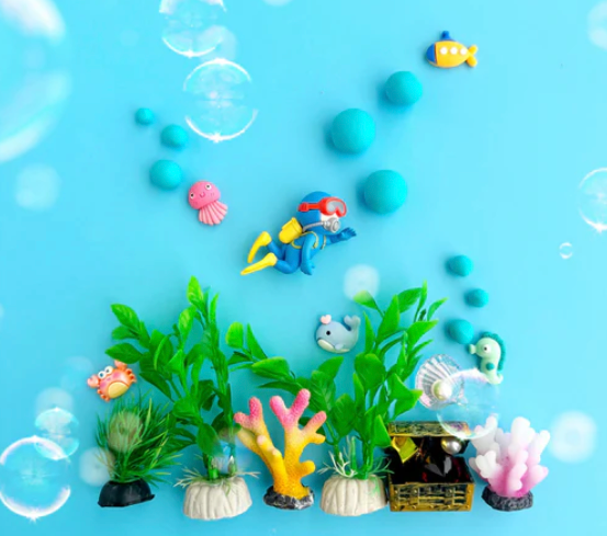 Includes: 8 oz Light Blue (Blue Hawaiian) KidDough with Ocean Charms Hidden Inside - Crab, Seahorse, Submarine, Jellyfish, Whale, and Mermaid, Scuba Diver Figurine, Aquatic Plants, Coral Resin Figurine, Iridescent Shell and Treasure Chest Complete with Treasure Inside