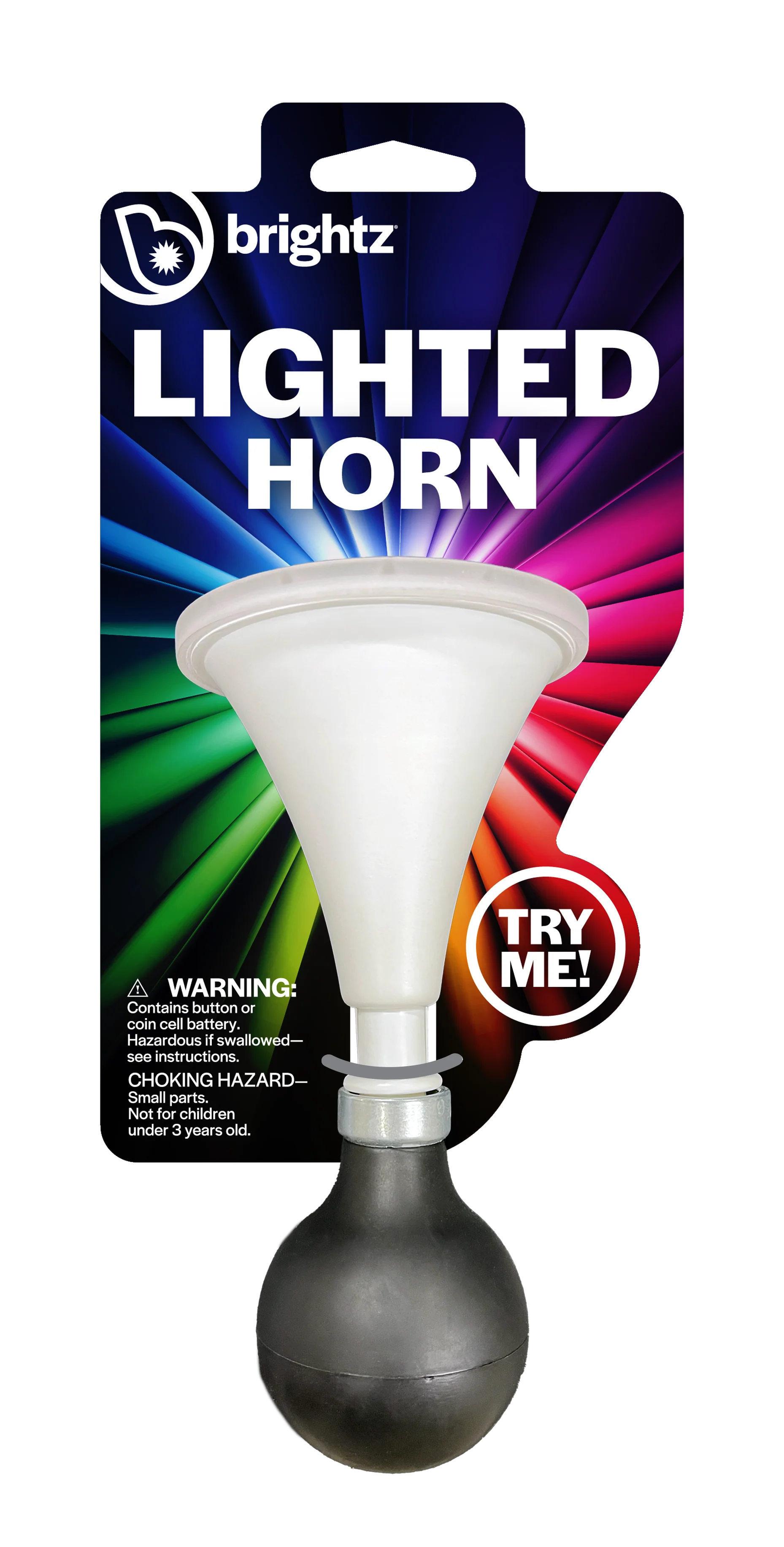 Add color and character to your ride with the Brightz LED Squish Horn: a light-up, squishy companion that brings fun and flair to any bike, scooter, or trike. This playful horn does more than just make noise... it shines! Just give it a squeeze to activate a vibrant LED light that morphs through the entire rainbow, turning heads wherever you go. It’s the perfect way to stand out and express your style at any age. The LED Squish Horn combines sound and light in one delightful package. With each honk, the rainbow-colored LED kicks on, creating a magical effect that kids and adults alike will love. Installation is quick and easy with a built-in thumbscrew that securely attaches the horn to most handlebars. No tools needed. It comes ready to ride with two CR2032 batteries included, offering up to five hours of light-up fun straight out of the package.