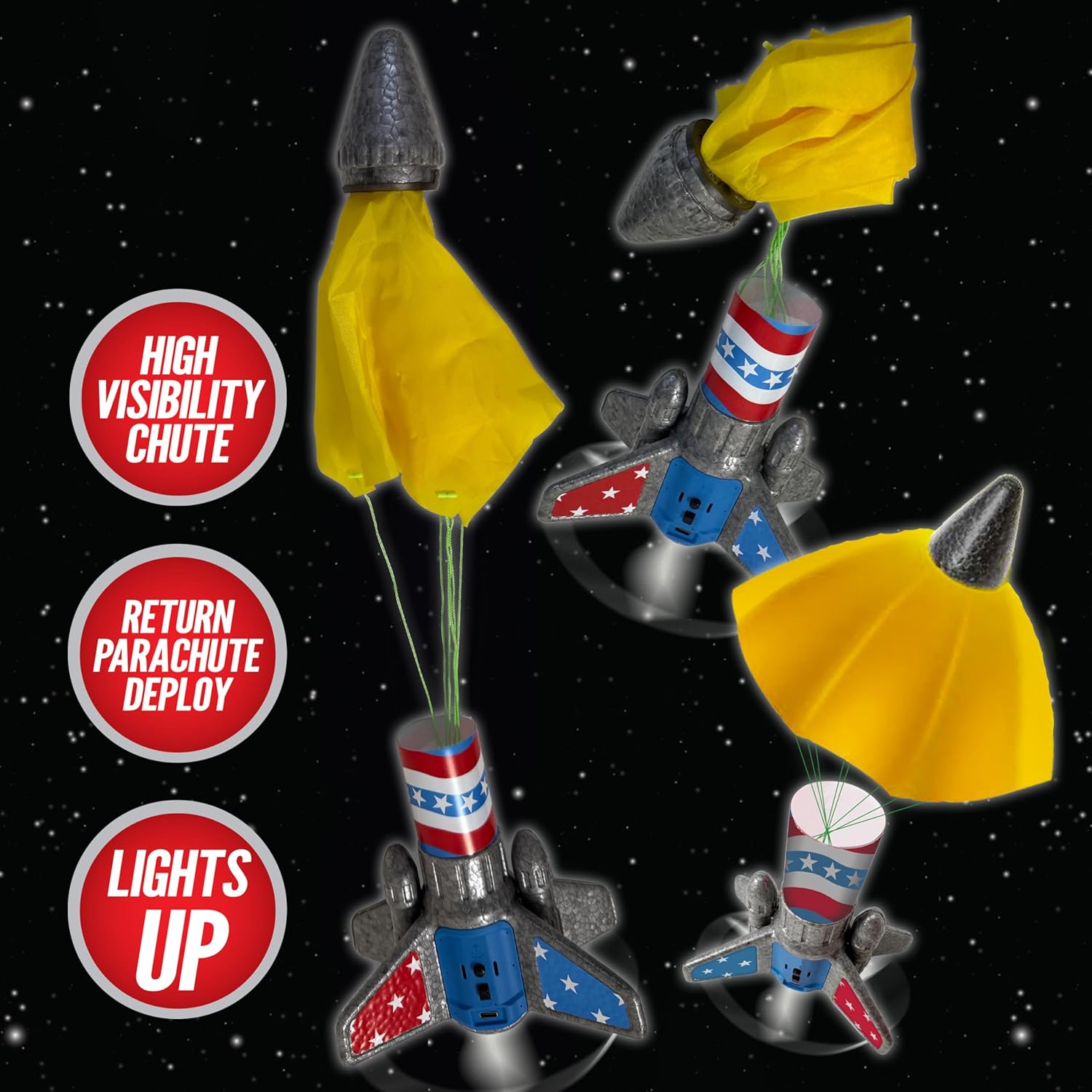• Kit includes rocket, parachute, safety blade, 2 screws, screwdriver, instructions, and USB-C charging cable. No additional batteries are needed. Packaged in a colorful box for gift giving.