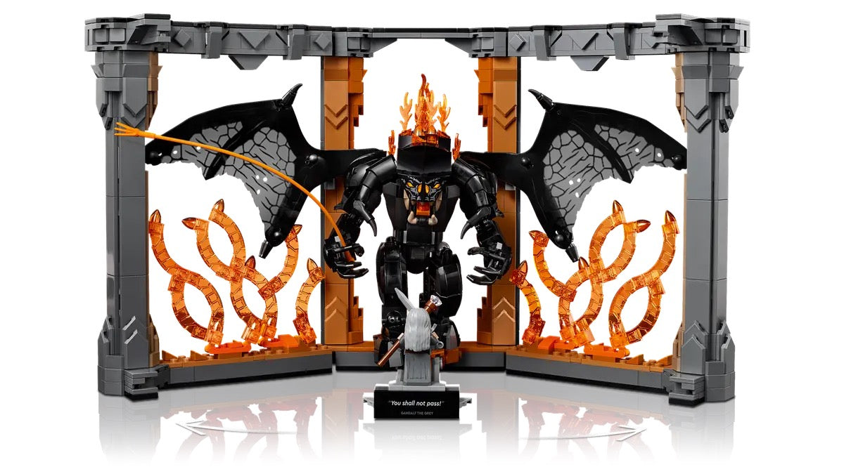 Bearing a plaque with the words ‘You Shall Not Pass’, the model depicts Gandalf the Grey™ in a fearless stance and the Balrog with its mighty wings unfurled against a blazing wall of flames. Both characters are detachable and the Gandalf minifigure has a staff and sword, while the Balrog figure wields a fiery whip and features posable limbs and wings for dynamic display.
