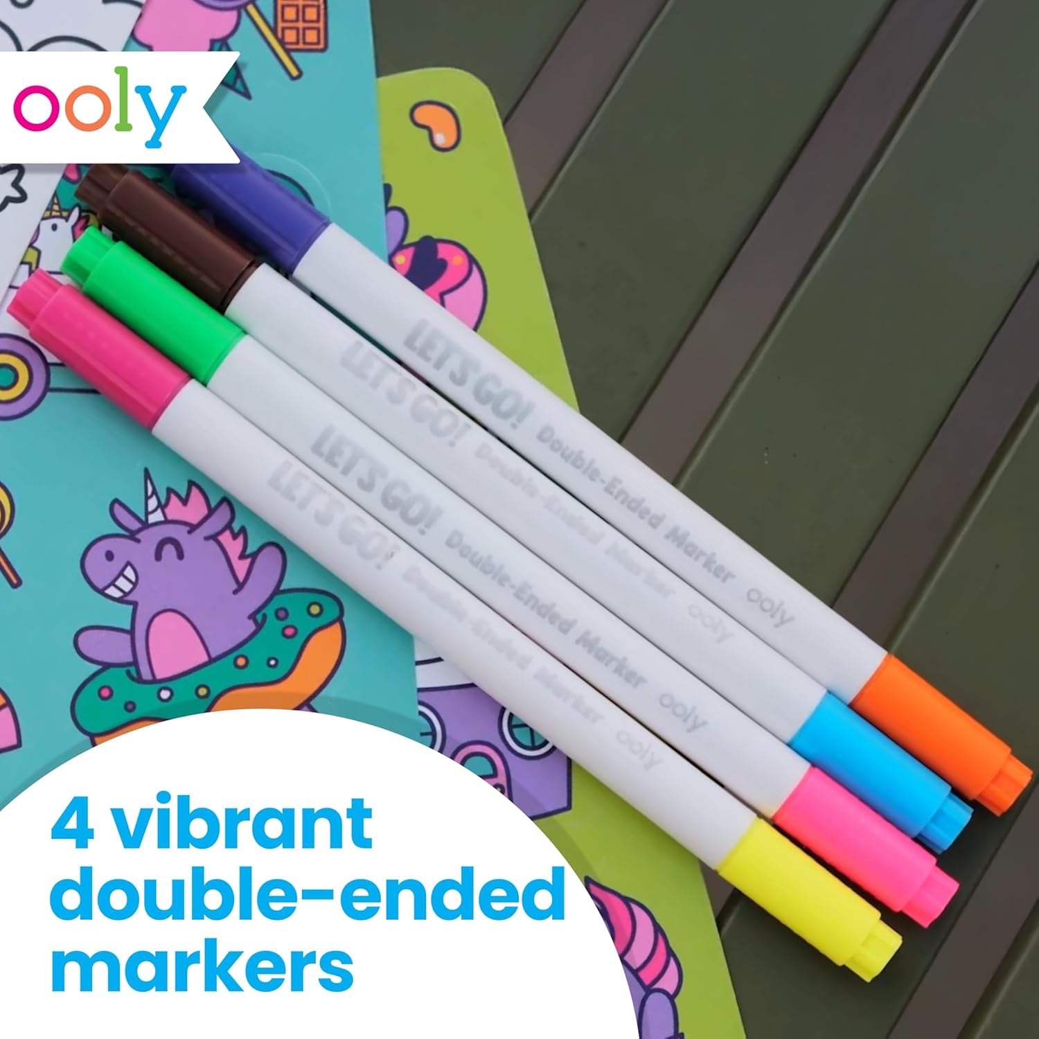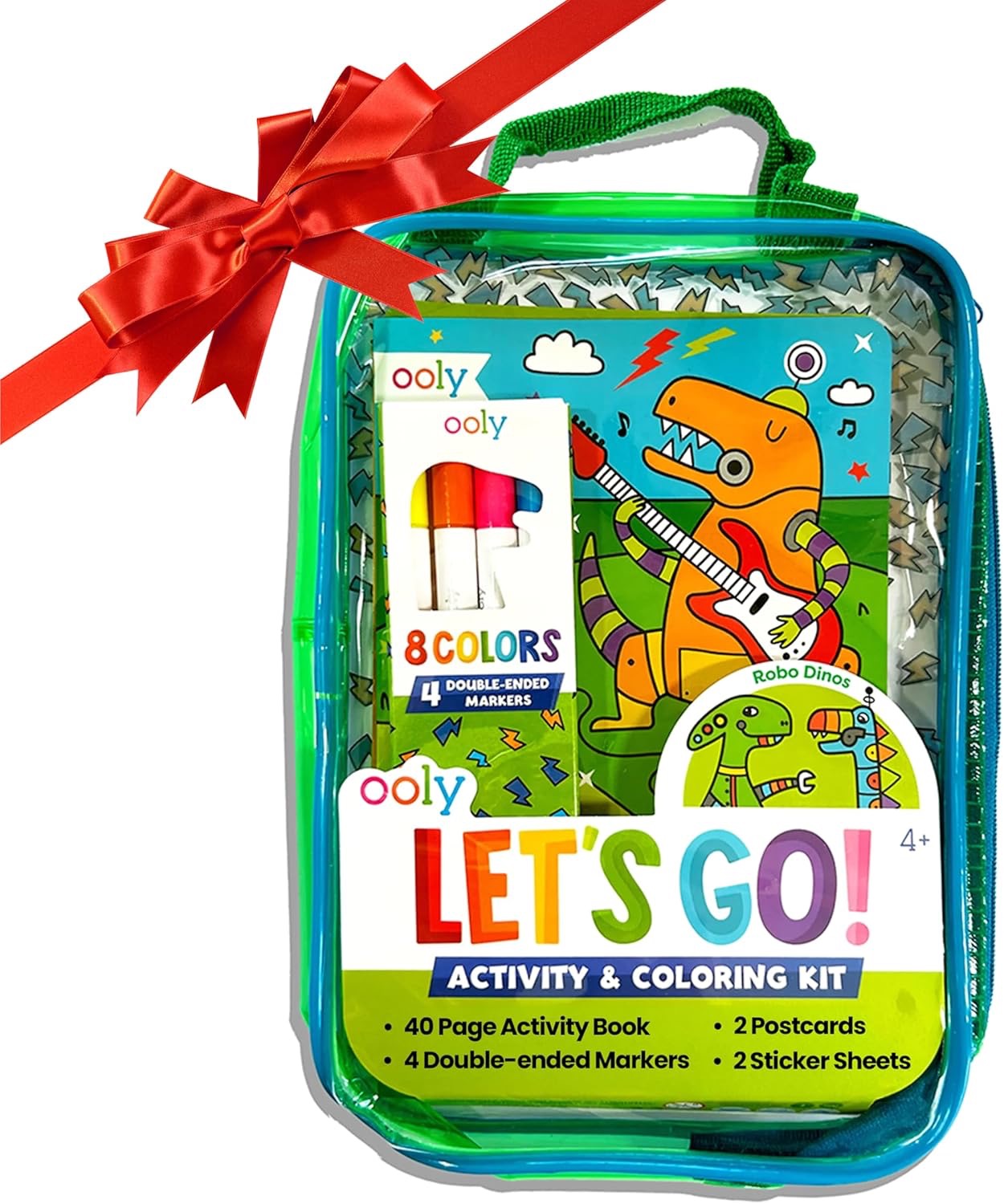 • [WHAT'S INCLUDED]: Within the Let's Go Activity Kit, there is a 40 page activity book, 2 sticker sheets, 2 color-in postcards AND 4 double-sided markers with a total of 8 colors ALL inside of a cute bag to carry everything
