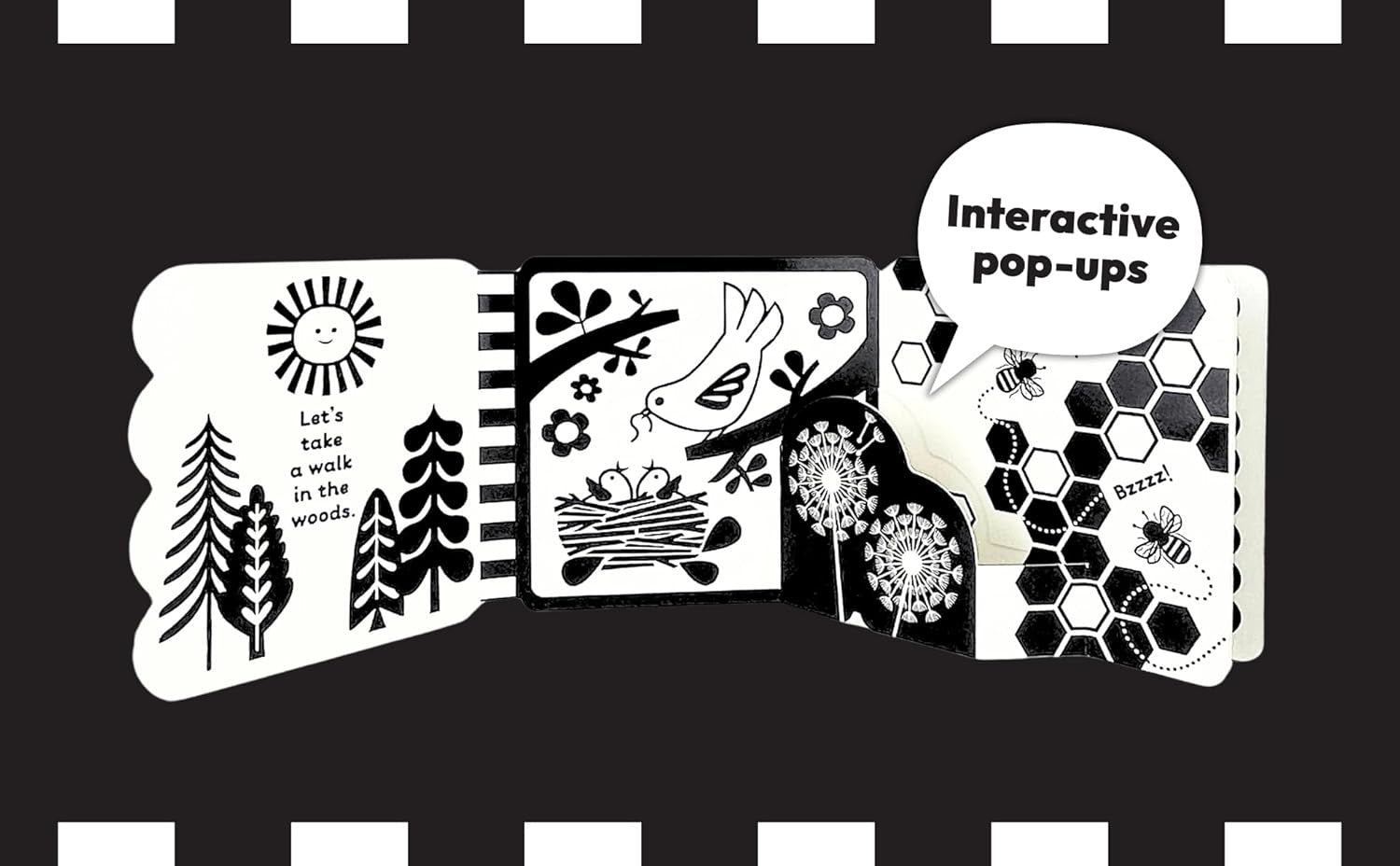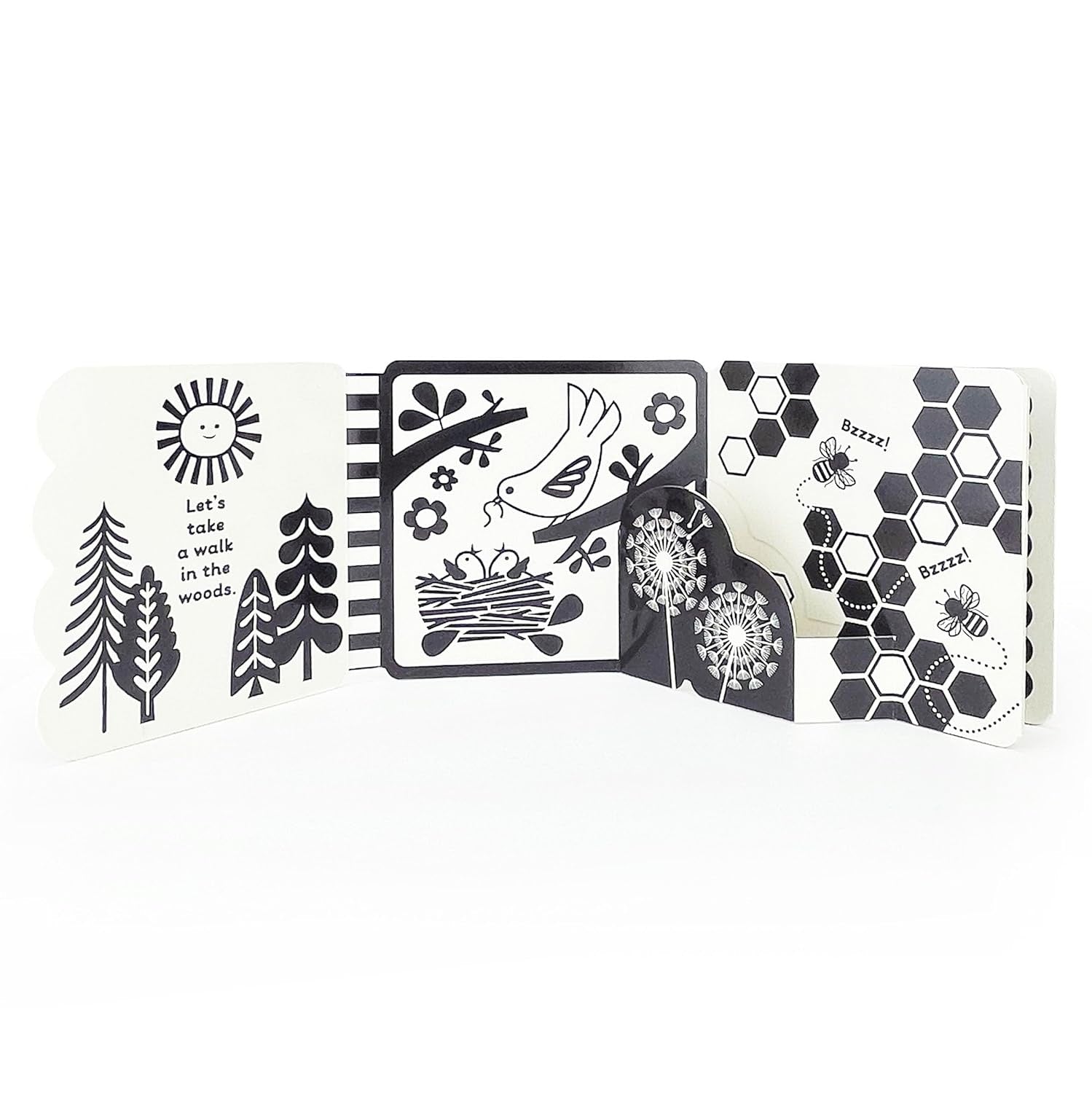 Reading is learning! Even the littlest babies can see and follow high-contrast images, which helps improve their vision and focus. Take a walk in the woods with this engaging book to stimulate your infant’s visual senses and introduce woodlandflora and fauna. The beautiful black and white images and exciting pop-ups on sturdy board pages will captivate your baby as they grow. And this unique double-sided accordion-style format unfolds to lay flat for a fun tummy time experience! Use your imagination to help your baby explore each scene— babies love to listen to their parents voices which improves communication skills.