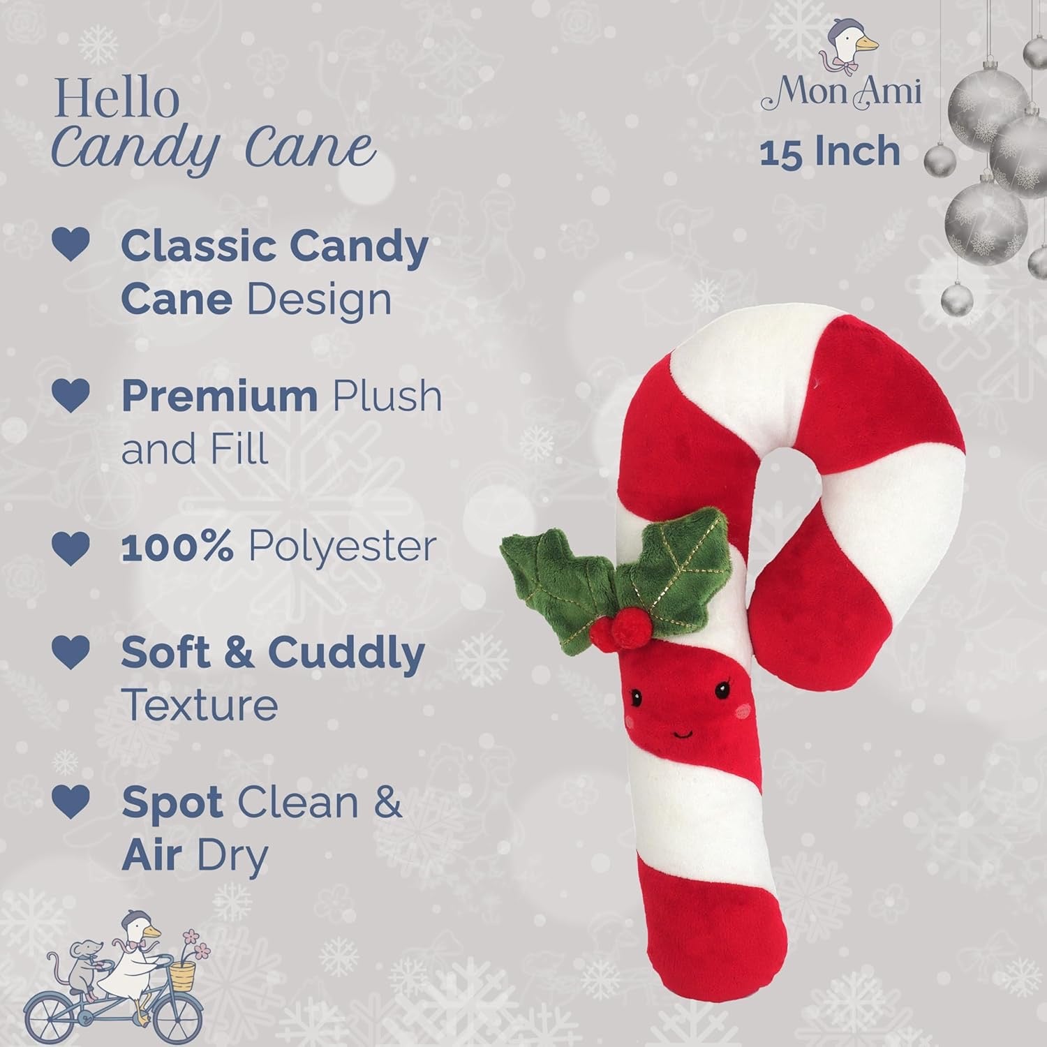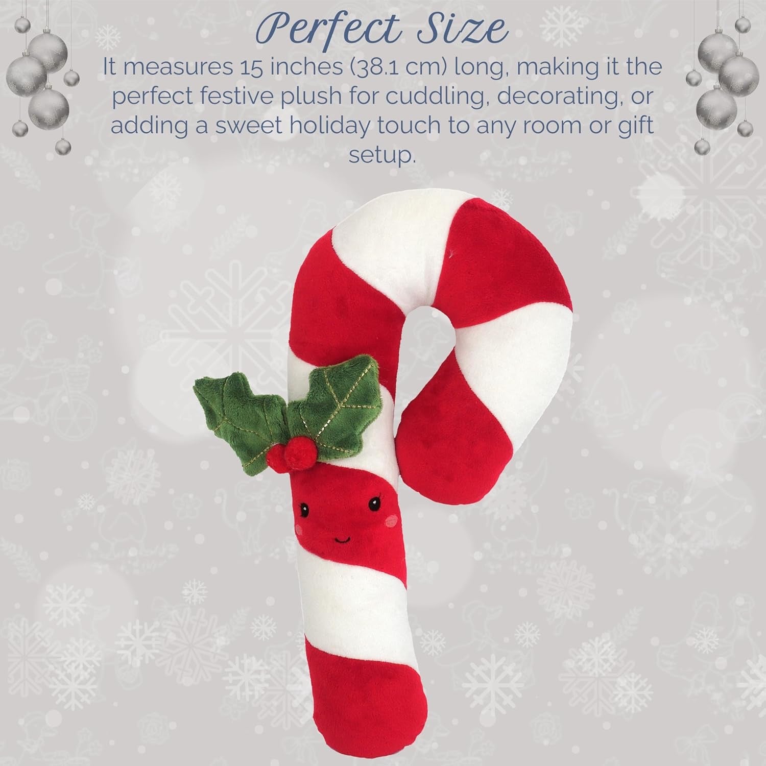 • CHRISTMAS CANDY CANE - It’s not Christmas without a candy cane! And Mon Ami’s Candy Cane Plush Toy is an extra-special sweet treat. Featuring a cute-as-can-be embroidered face and oh-so-festive sprig of holly, our pretty red Christmas plush toy gives a peppermint twist to a kid’s playroom. You can also ensure your Christmas display is in mint condition with our personality-packed candy cane plush toy, easy to mix with other tasty Christmas plush toys from our holiday collection.