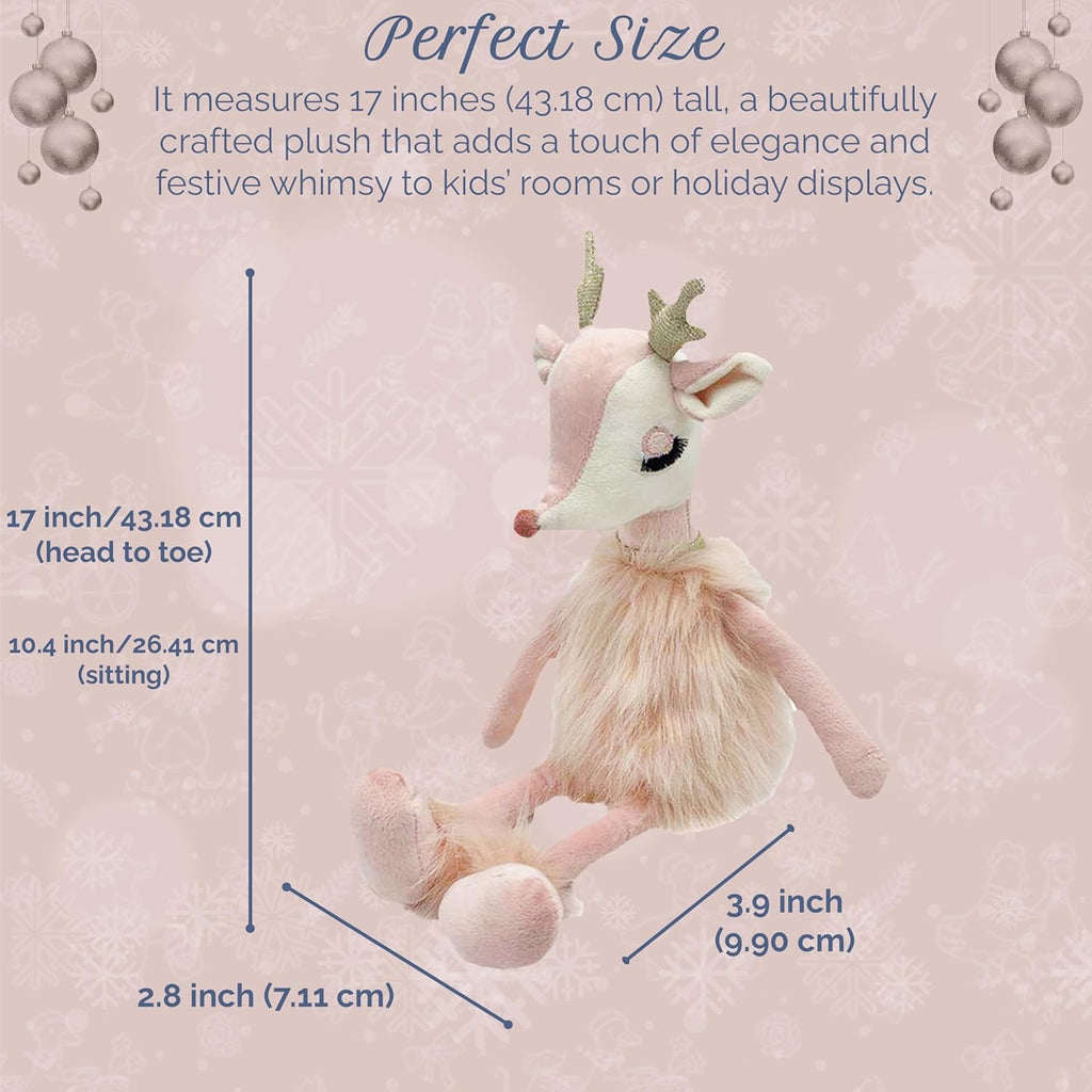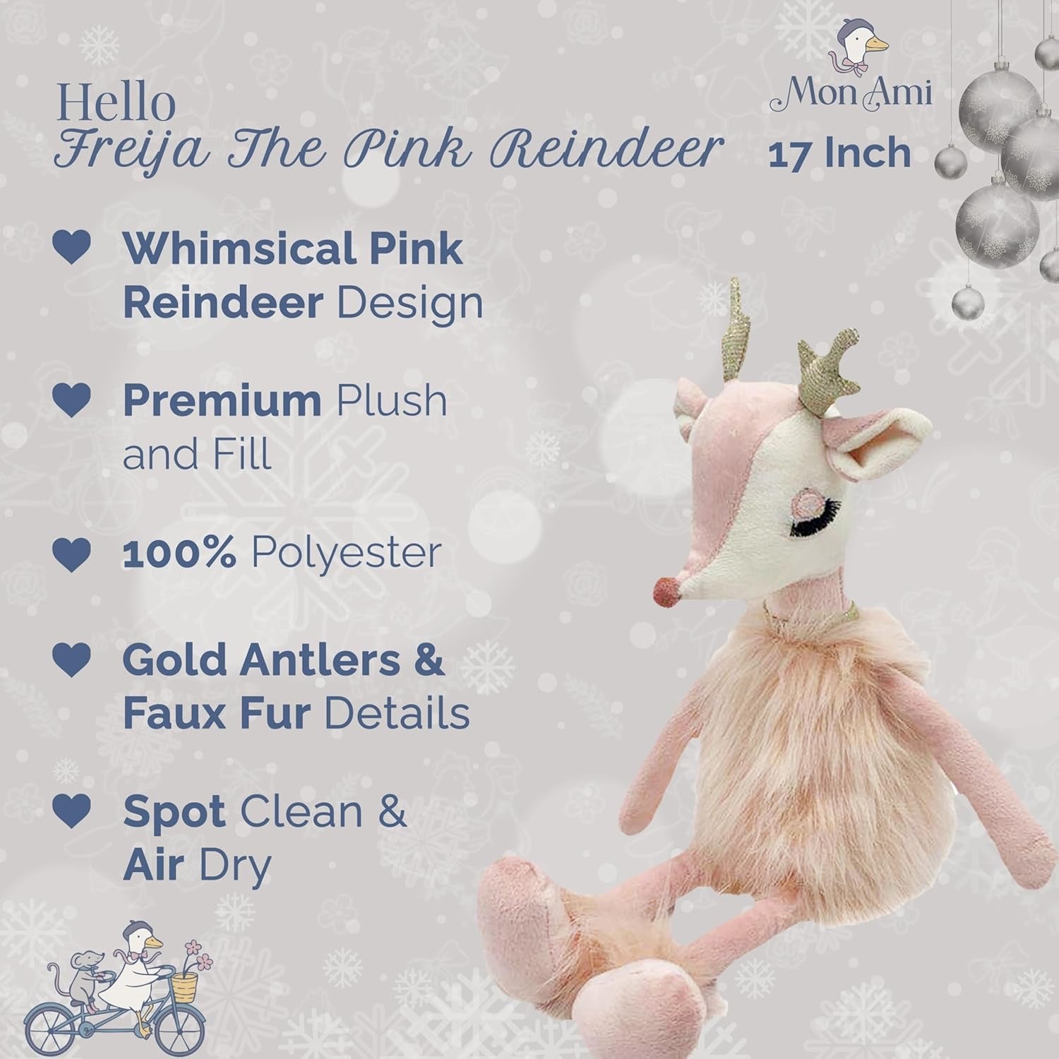 • WHIMSICAL HOLIDAY TOY: Freija The Pink Reindeer is a charming and whimsical stuffed animal with cotton-candy pink faux fur, a dainty pink nose, and fancy gold antlers. This delightful reindeer stands out among other holiday toys, making it the perfect addition to any child's collection during the festive season.