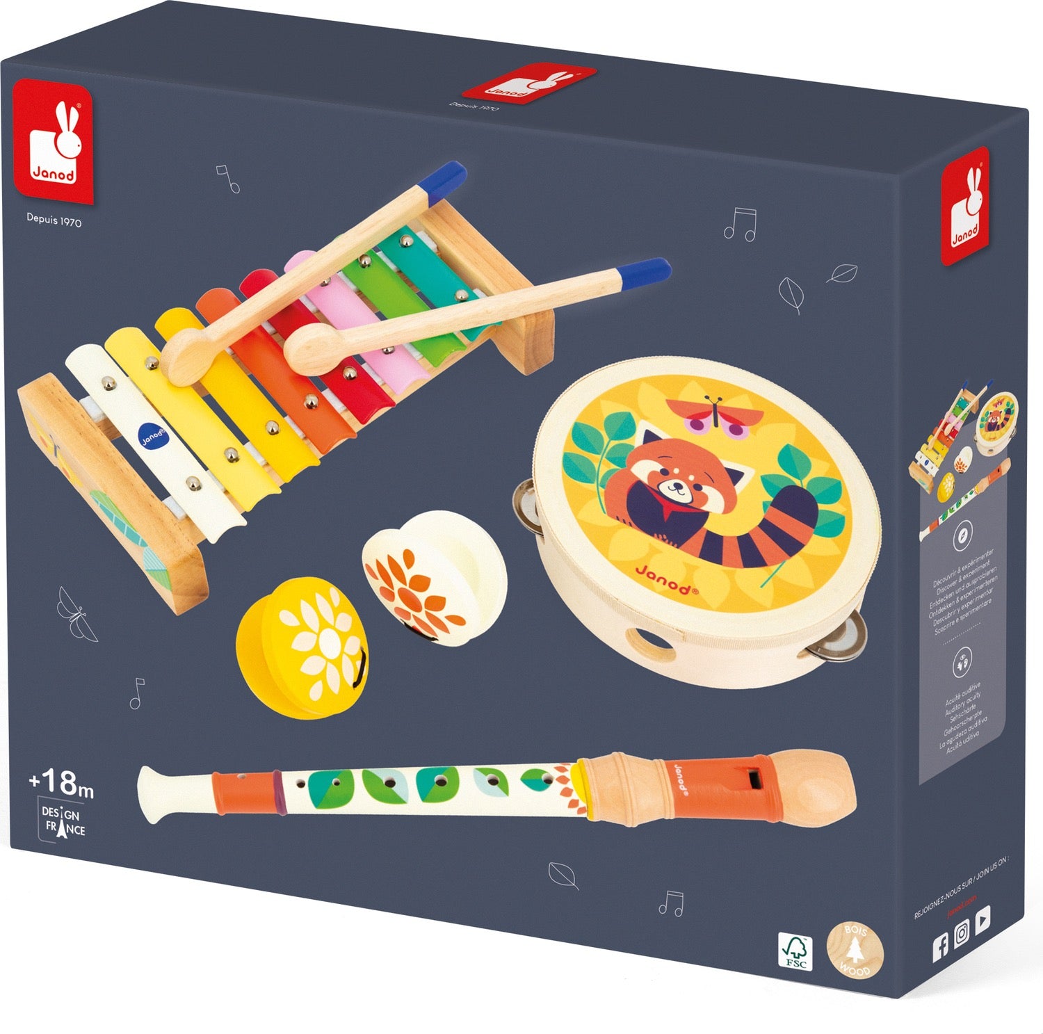 Let the music begin! Help your child discover music with this colorful and cheerful musical set! This set includes a xylophone with 8 notes, a tambourine, a recorder and two castanets. Your child will have all the equipment they need to discover sounds and learn about the art of music - perfect for starting life as a performer. Musical imitation toy made from FSCTM wood.