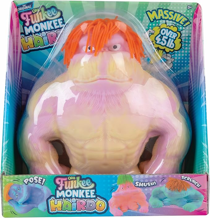 Introducing the most stylish, most fun, most hip Funkee Monkee Around! If you went BANANAS for the Original Jumbo Funkee Monkee, get ready to go crazy for the new Jumbo Hairdo Funkee Monkee! This brand new Jumbo Funkee Monkee weighs in at over a whopping 4.5 pounds, has a brand new Yellow and Pink tie-dye skin that makes every Jumbo Hairdo Funkee Monkee unique, as well as brand new wiggly, jiggly, stretchy Orange hair! Twist, shape, squeeze, and pose your monkey to match your mood! Create funny expressions to entertain your friends! Smush it around and return it to its original shape! Irresistibly soft and squishy, the Jumbo Hairdo Funkee Monkee makes a fantastic gift for everyone - from kids to adults. Once you pick it up, you just won’t want to put it down! Jumbo Hairdo Funkee Monkee’s skin is composed of a custom blended, extra-strength thermoplastic rubber, and is filled with a specially formulated silica designed to hold a pose. This makes this monkey super durable and washable for extra long lasting fun!