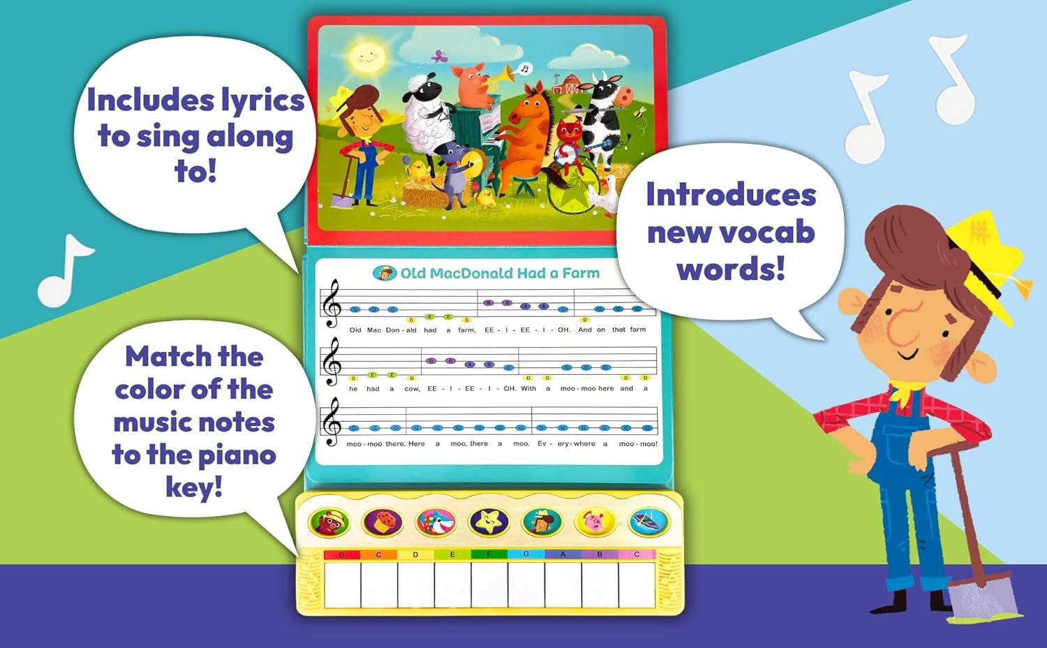 Children can play the piano along with their favorite songs with this wonderful board book! Piano is a great first instrument for budding musicians, and these classic and familiar nursery rhymes will spark their interest. The beginner melodies and brightly-colored notes make it easy for your child to get started. Press the buttons to hear the songs at the same time your children are playing along. The lyrics are included for sing-along fun as well! Music is learning, too!